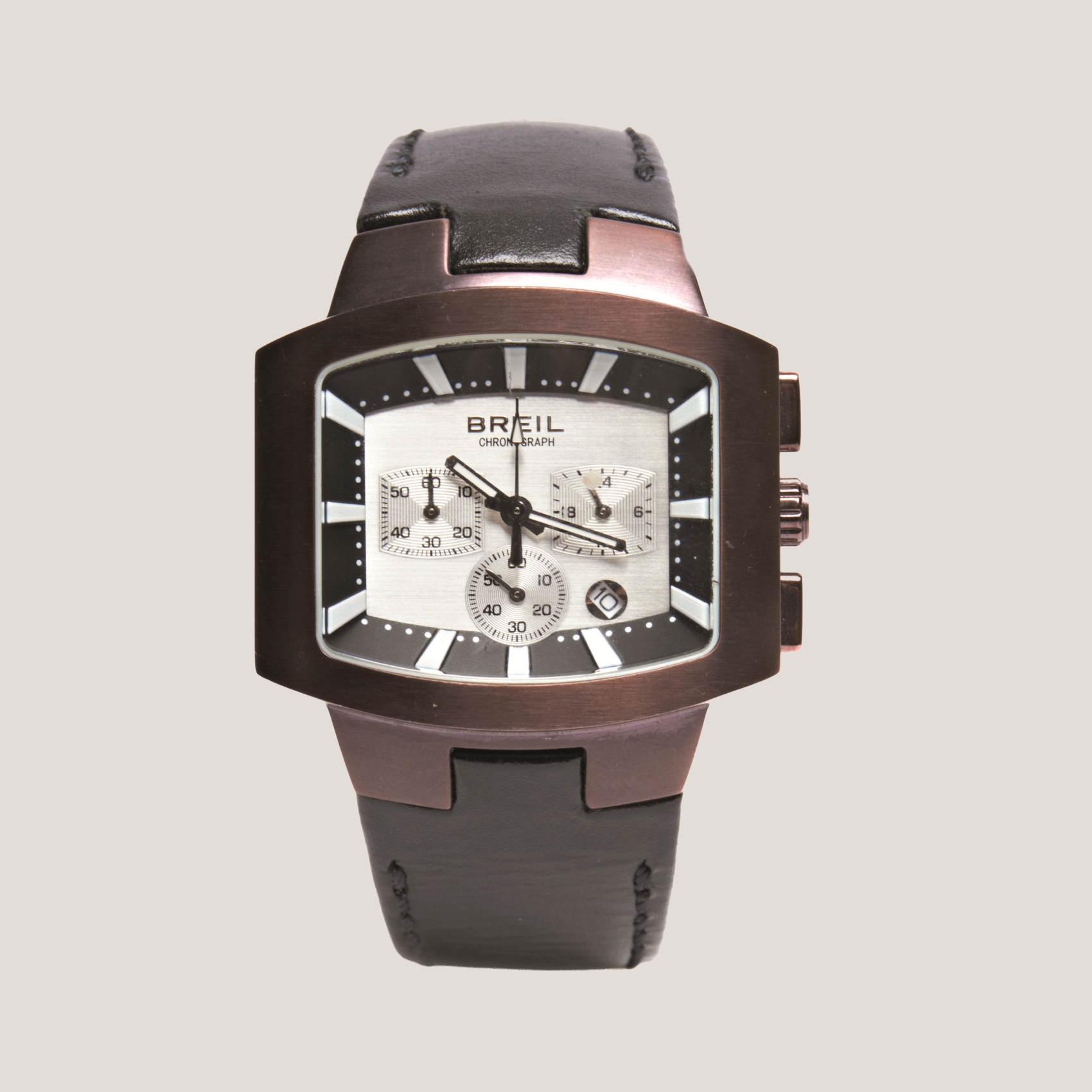 BREIL. Reloj de pulsera para caballero. En acero pavonado de tonalidad marrón y correa de piel. Esfera plateada con tres esferas complementarias. Numeración a trazos aplicados. Calendario fecha entre 4 y 5. Cronógrafo. Mecanismo de quartz.