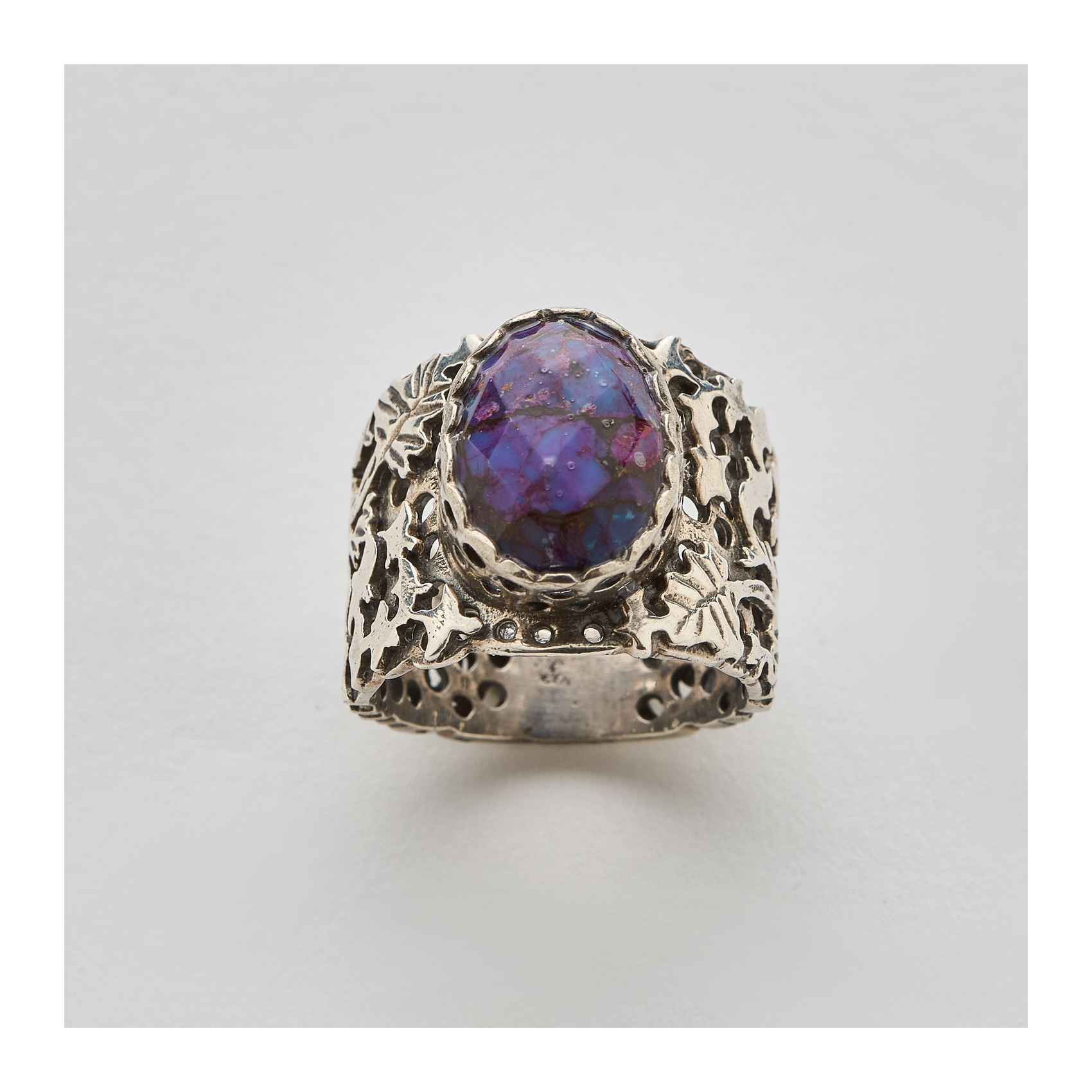 Sortija en plata con motivos vegetales calados y piedra en tonalidad púrpura de 13 x 9 mm.