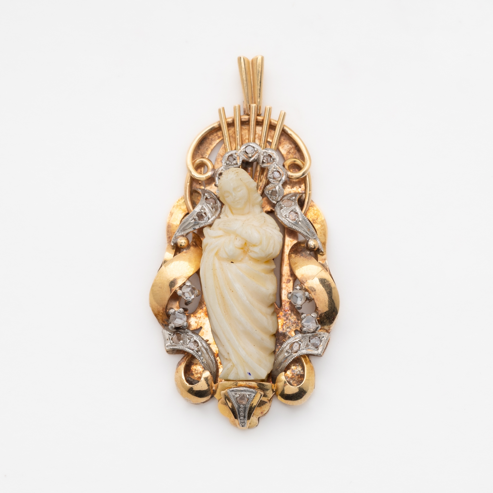Medalla devocional tipo capilla en oro y vistas en platino con Virgen en resina y diamantes talla rosa, c.1940.