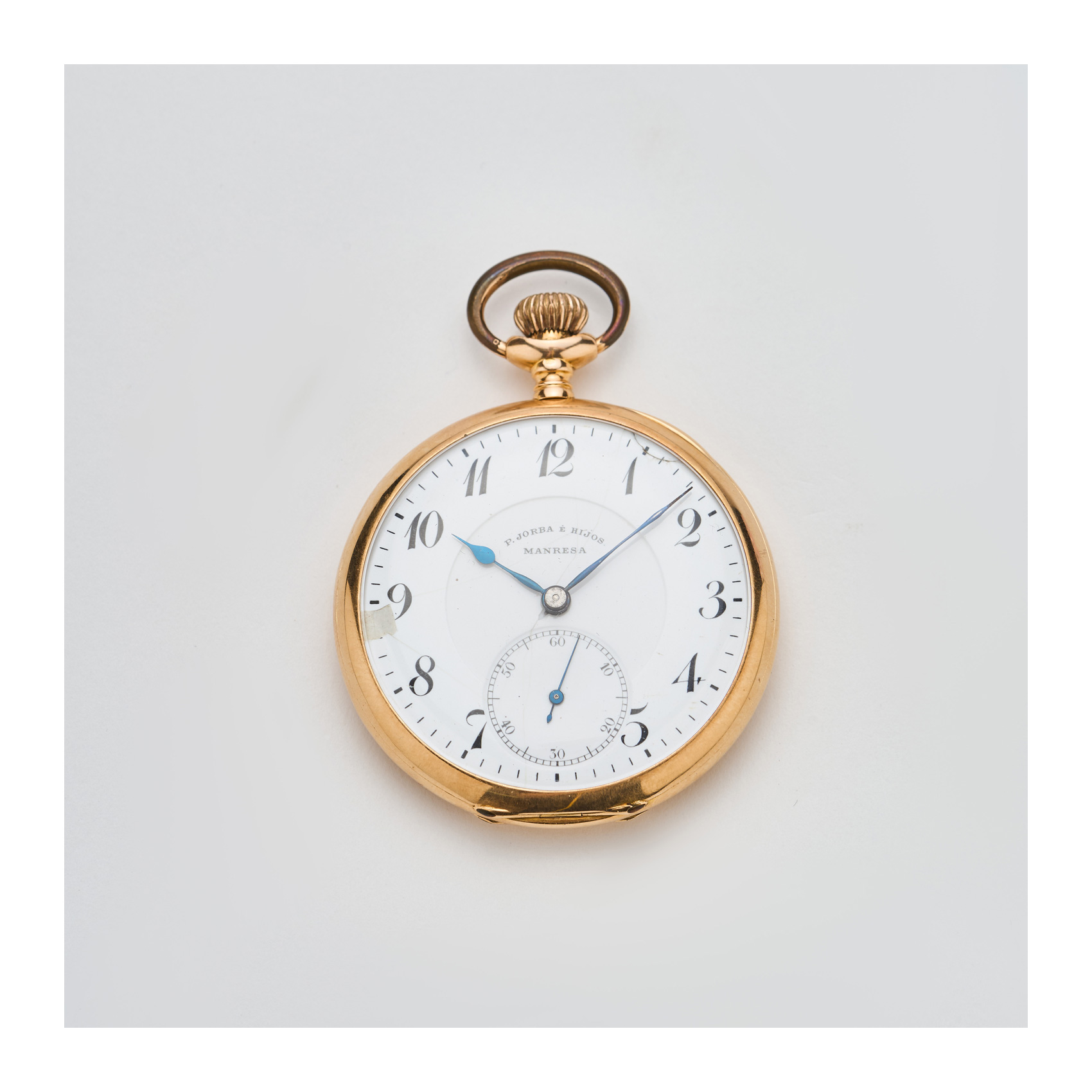 P. JORBA E HIJOS, Manresa. Reloj de bolsillo en oro, primer cuarto del s. XX. Esfera de porcelana con numeración arábiga. Segundero a las 6. Reverso con decoración guilloché y cartela con iniciales grabadas. Mecanismo de cuerda manual.