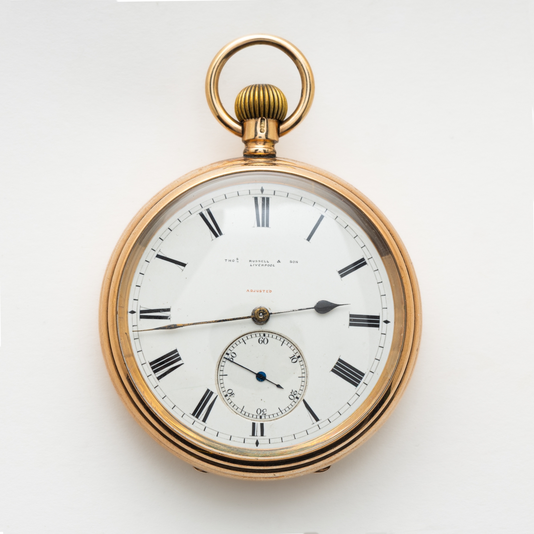THOMAS RUSSELL & Son en Liverpool. Reloj de bolsillo lepine en oro de 9, s. XIX. Esfera de porcelana con numeración romana. Segundero a las 6. Mecanismo de cuerda manual.