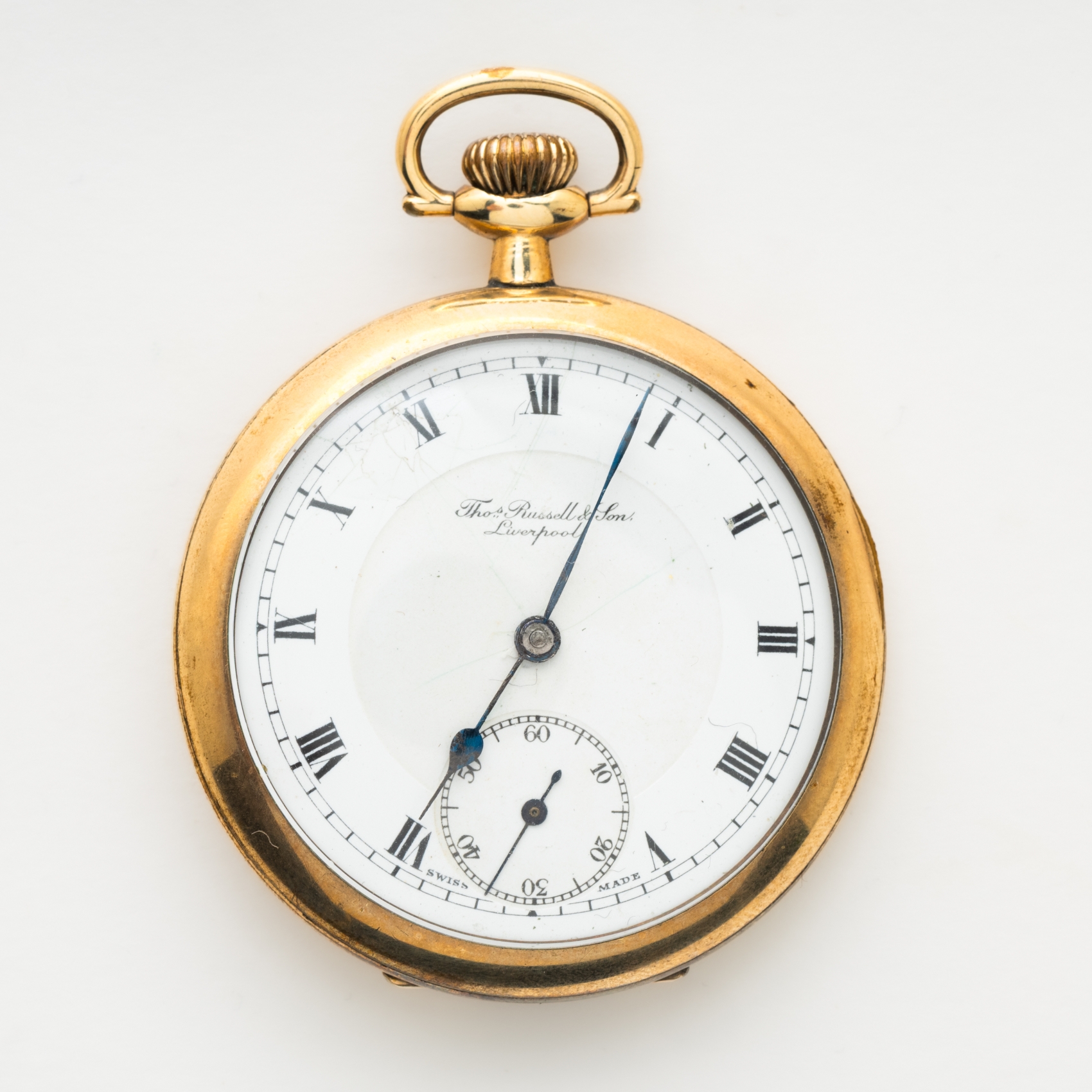 THOMAS RUSELL, Liverpool. Reloj de bolsillo lepin en oro de 14K, c.1930. Esfera de porcelana con numeración romana. Segundero a las 6.