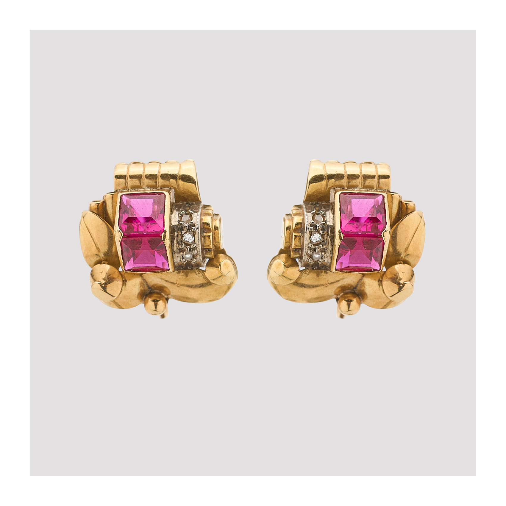 Pendientes Chevalier en oro con símiles de rubí talla carré y diamantes talla rosa, c. 1950.