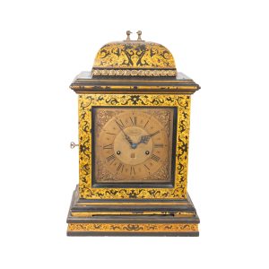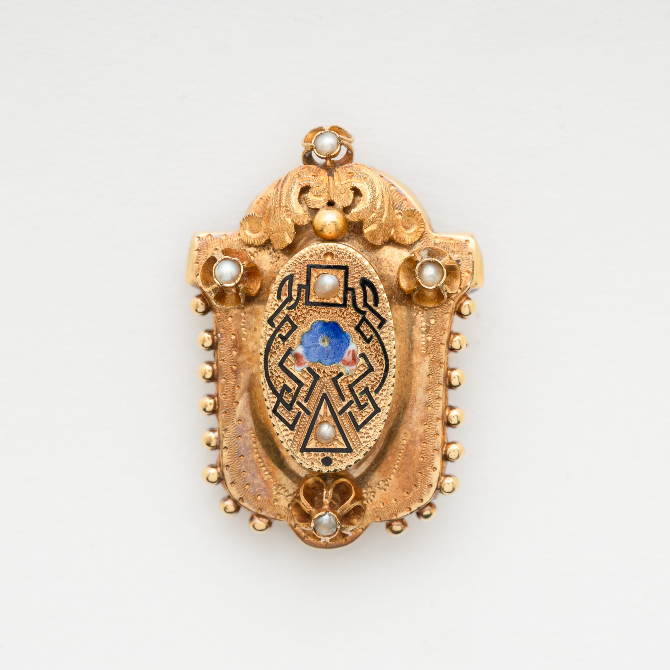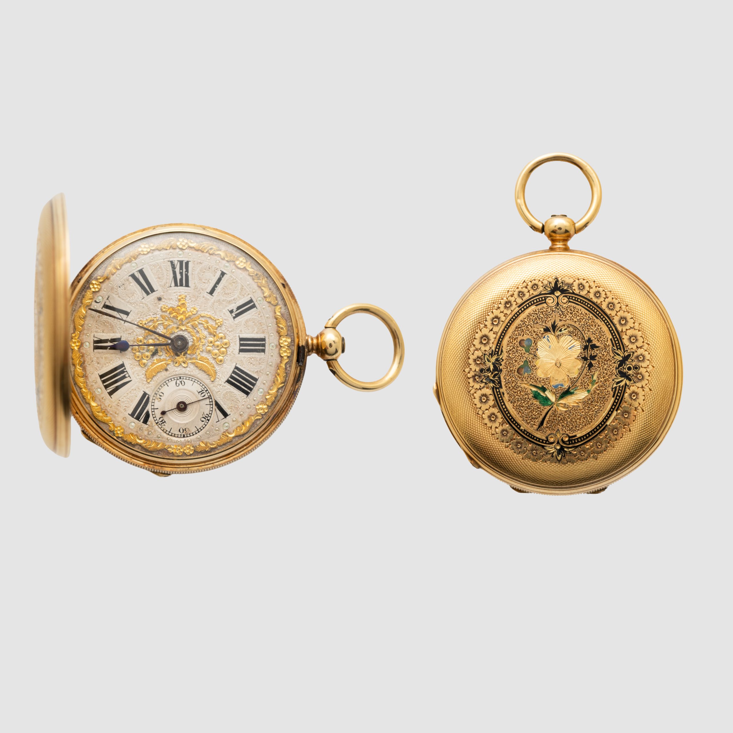 Boche y reloj saboneta de señora en oro, esmalte y perlas de aljofar, tercer cuarto del s.XIX. El reloj presenta un esmalte floral central sobre un fondo con textura guilloché en anverso y cartela con iniciales en reverso. Esfera blanca, numeración romana y segundero a las 6, está decorada con centro y orla de motivos vegetales dorados. Mecanismo de cuerda manual a llave.