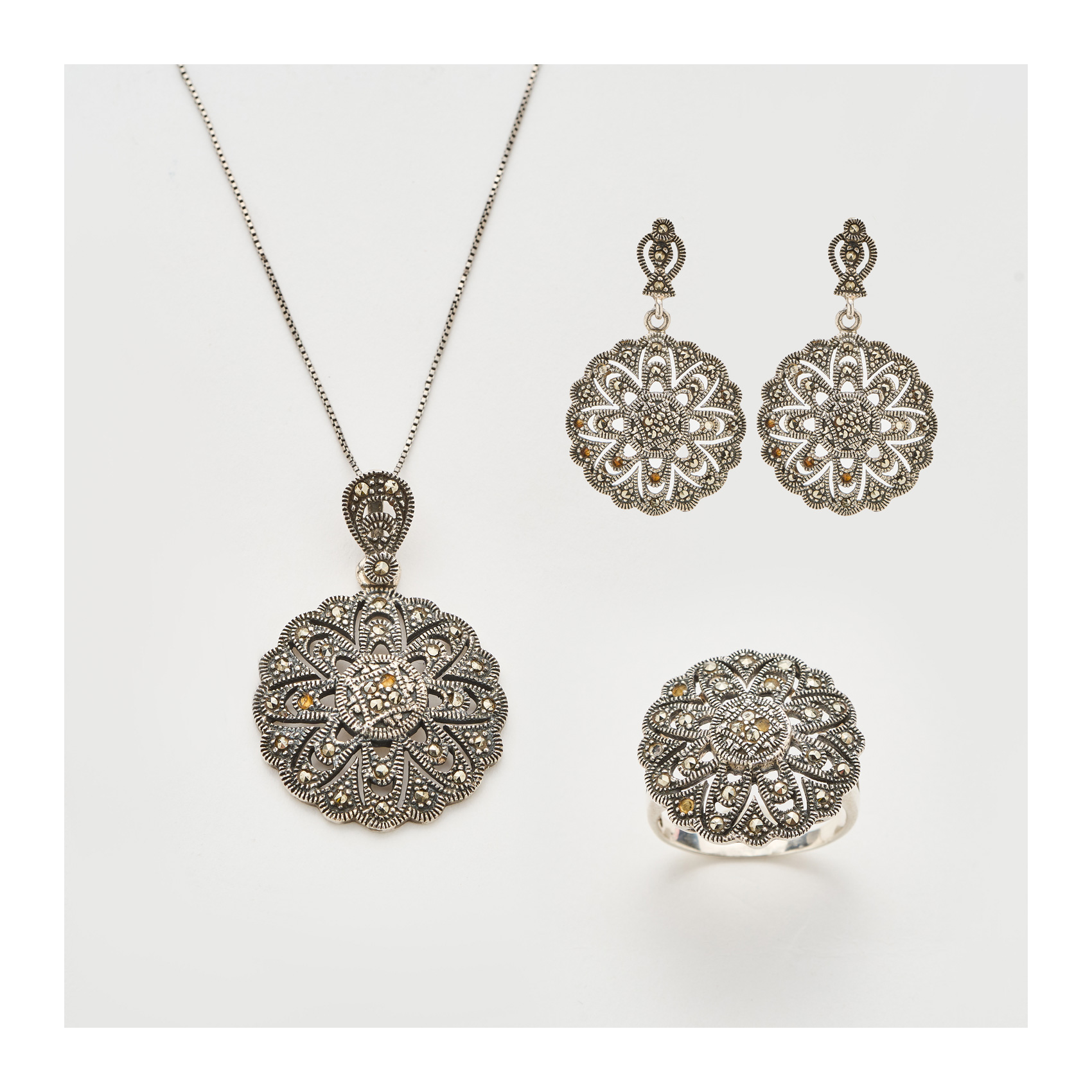 Juego de pendientes, colgante con cadena y sortija diseño flor calada en plata y marquesitas.