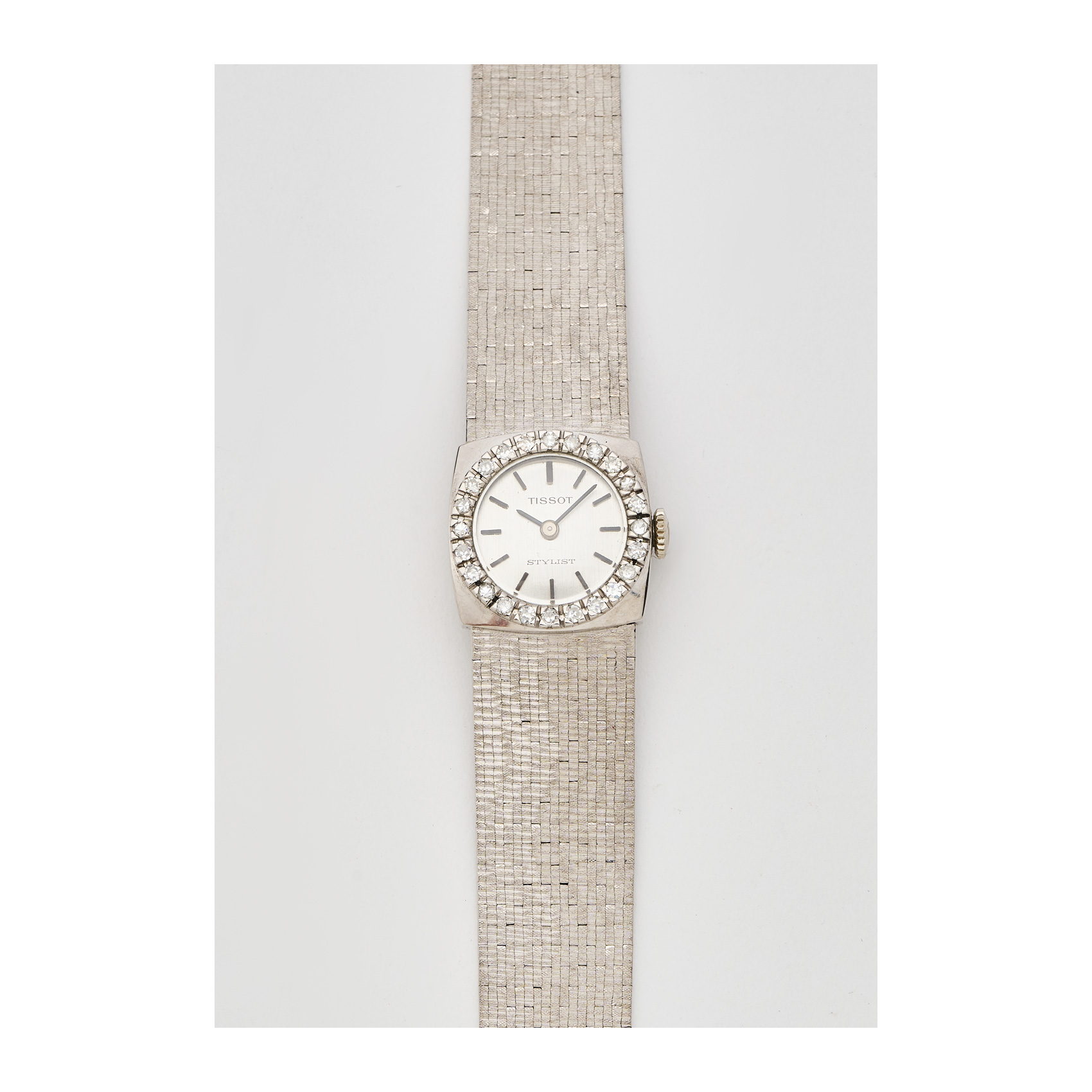 TISSOT Reloj de pulsera para señora. En oro blanco mate y brillo con orla de diamantes talla 8/8 engastados en garras. Esfera plateada con numeración a trazos aplicados. Mecanismo de cuerda manual.