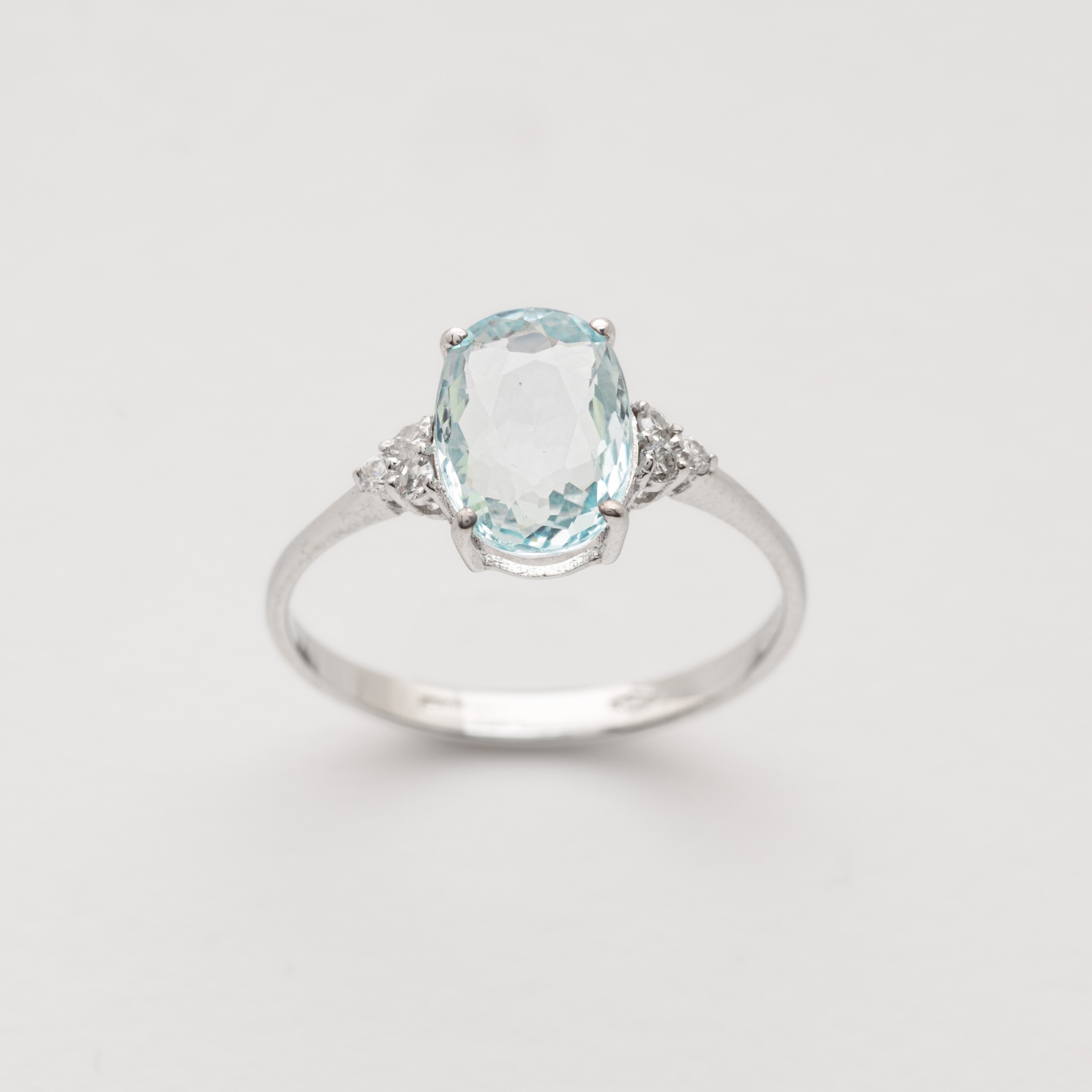 Sortija en oro blanco con aquamarina custodiado por trio de diamantes talla brillante.