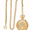 Reloj de bolsillo con cadena en oro 18K, fles. del s.XIX. Esfera blanca con aplicaciones florales doradas. Decoración vegetal en ambas tapas y cartela con iniciales en anverso. Segundero a las 6. Mecanismo remontoire.