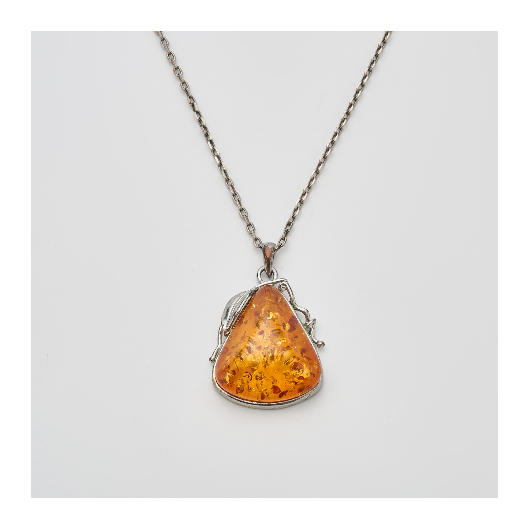 Colgante con espectacular ámbar triangular de 42 x 38 mm., decoración vegetal y cadena en plata.