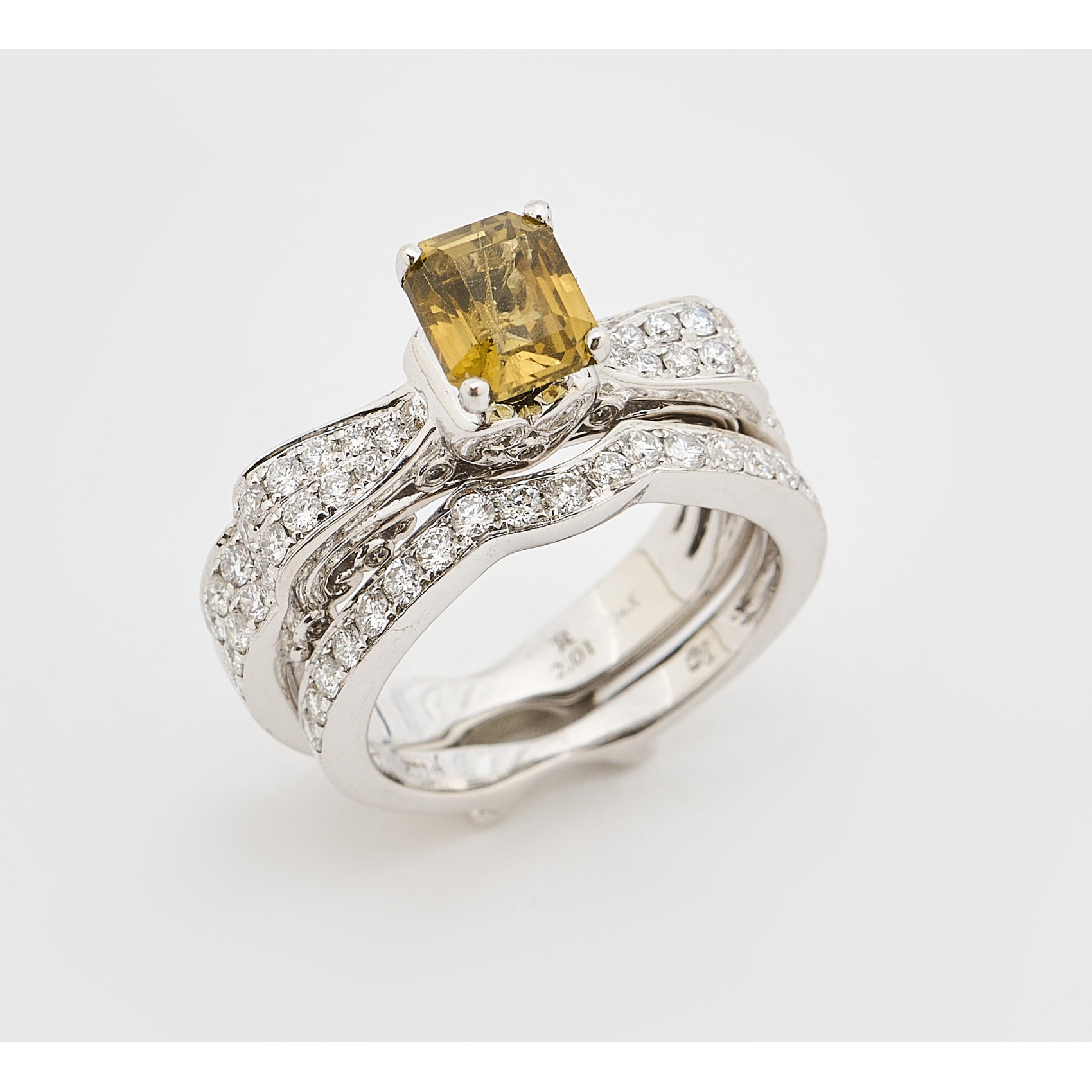 Dos sortijas adaptables en oro blanco, una con alejandrita deTanzania talla octogonal y otra diseño media alianza, ambas con diamantes talla brillante.