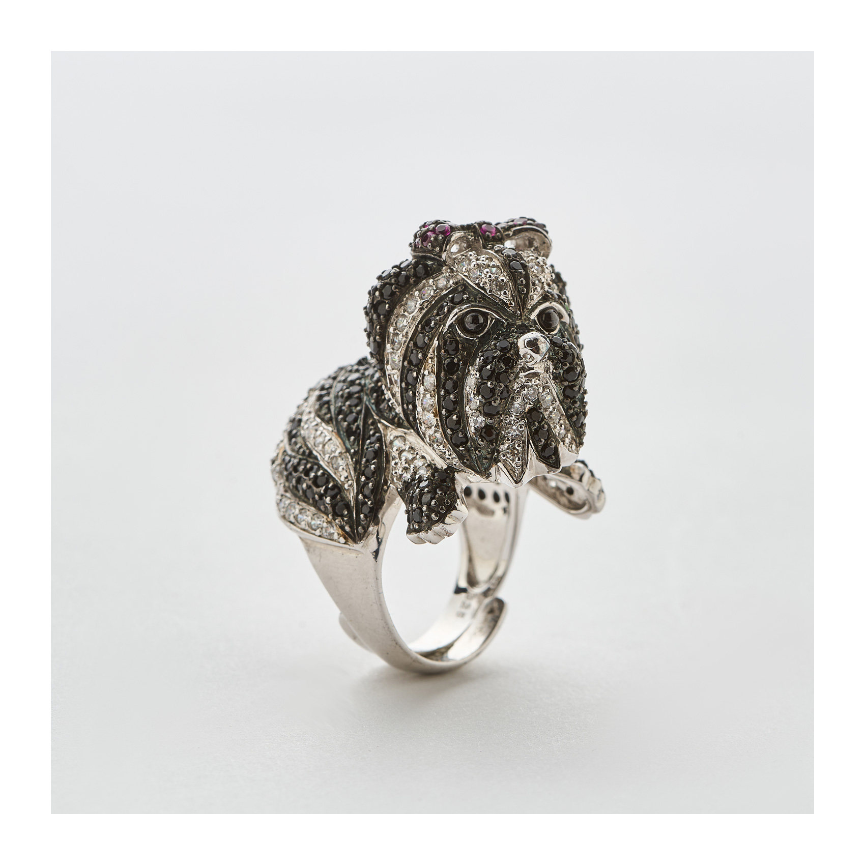 Sortija diseño perro en plata rodiada con circonitas negras, blancas y fucsias.