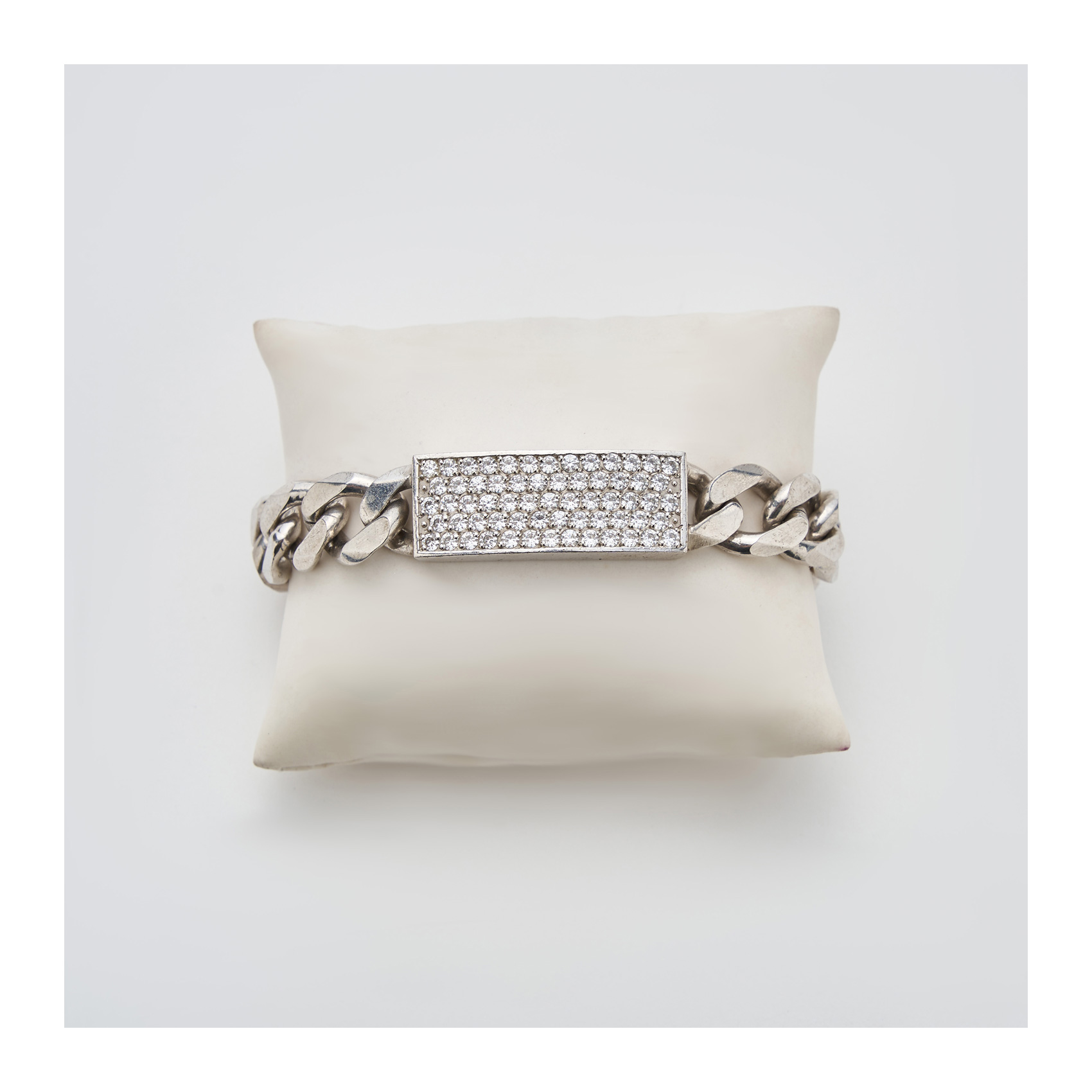 Pulsera nomeolvides de cadena barbada con placa cuajada de circonitas talla redonda.