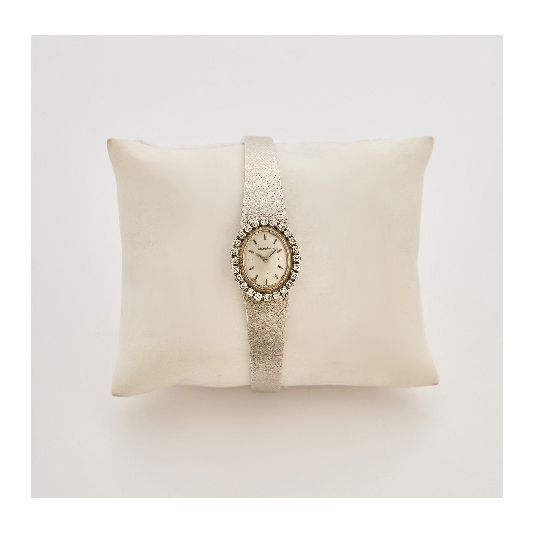 JAEGER-LECOULTRE Reloj de pulsera para señora en oro blanco y bisel con diamantes talla brillante. Esfera satinada con numeración a trazos aplicados, Mecanismo de cuerda manual.