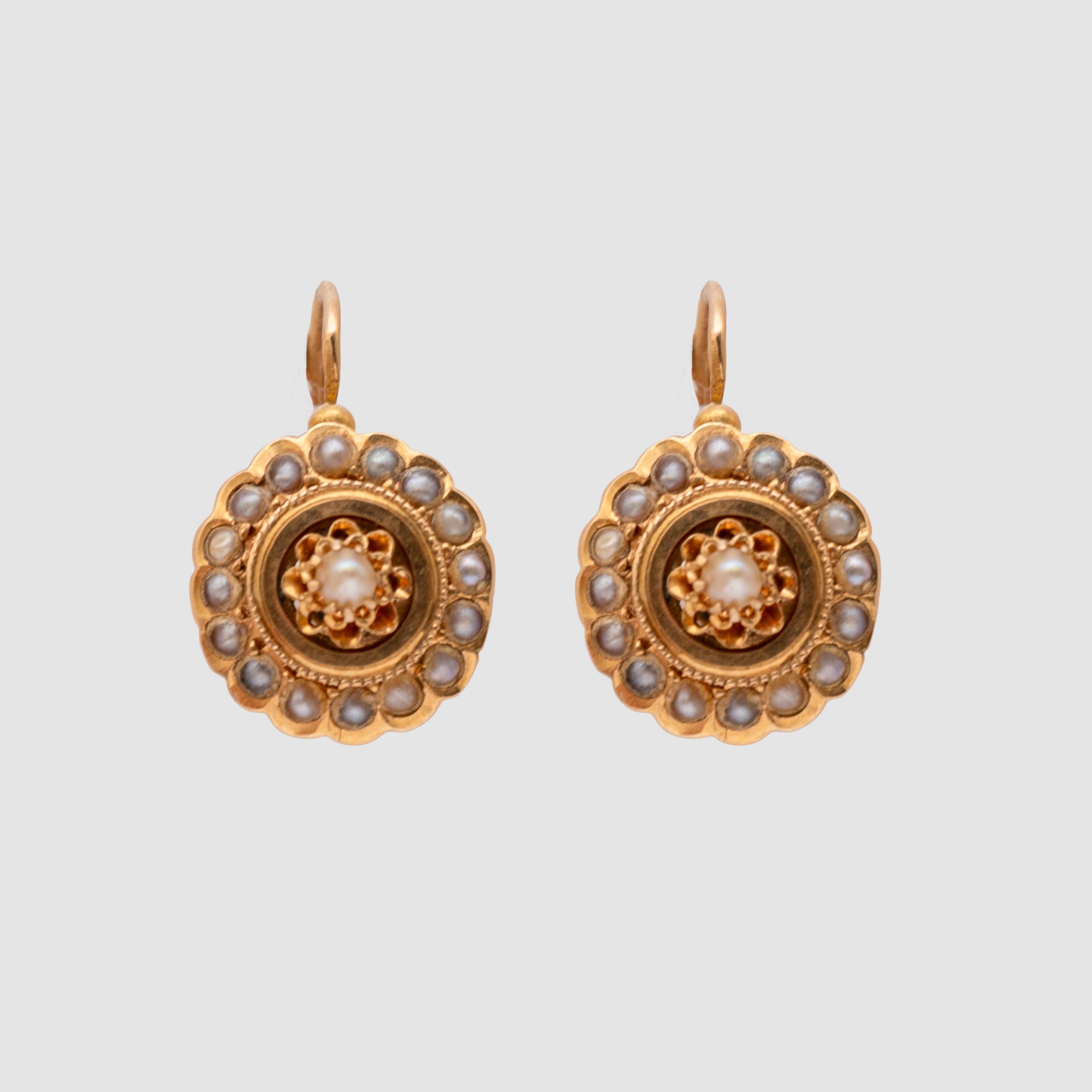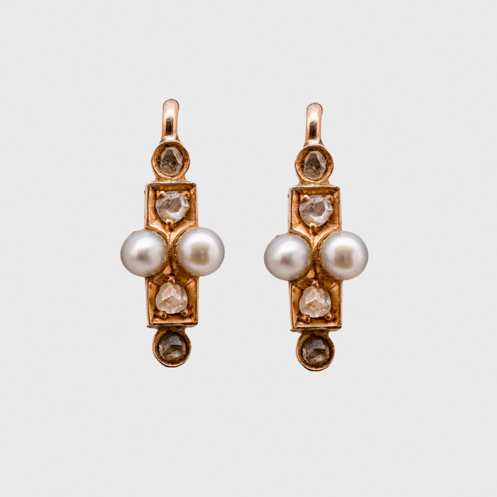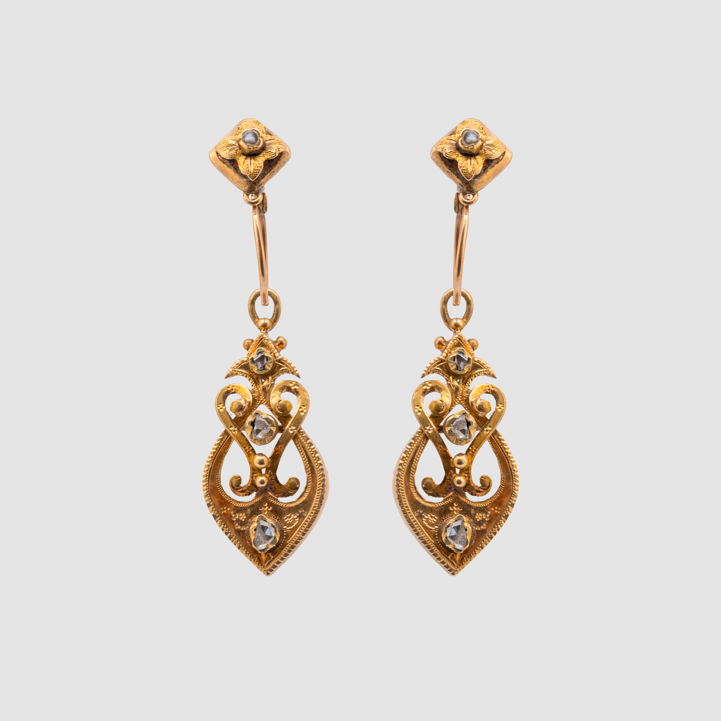 Tres pares de pendientes en oro, diamantes y perlas de aljofar, c.1900 y tercer cuarto del s.XIX.