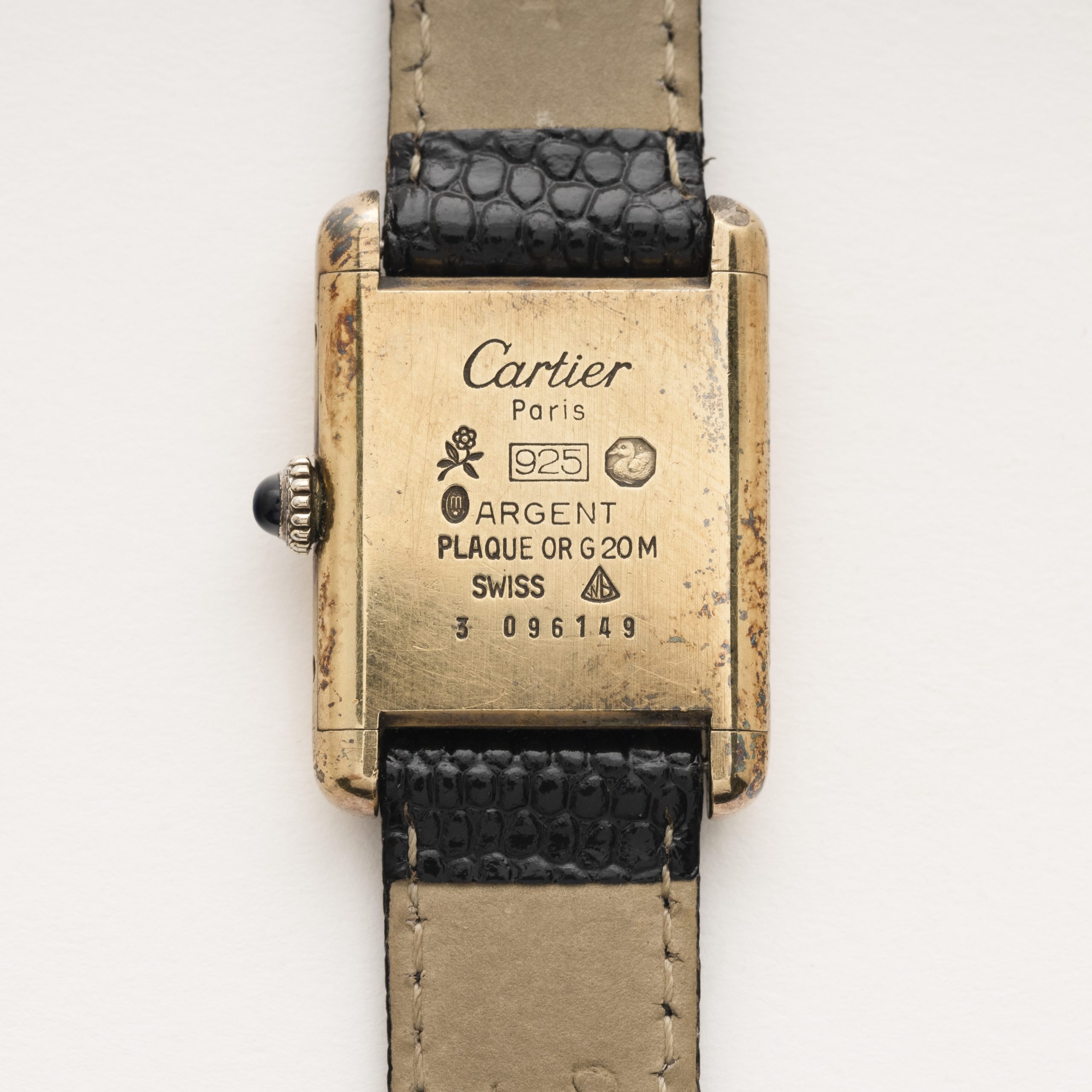 CARTIER «Must de Tank». Reloj en plaqué de oro con esfera en color crema. Corona con zafiro en cabujón. Mecanismo de cuerda manual.