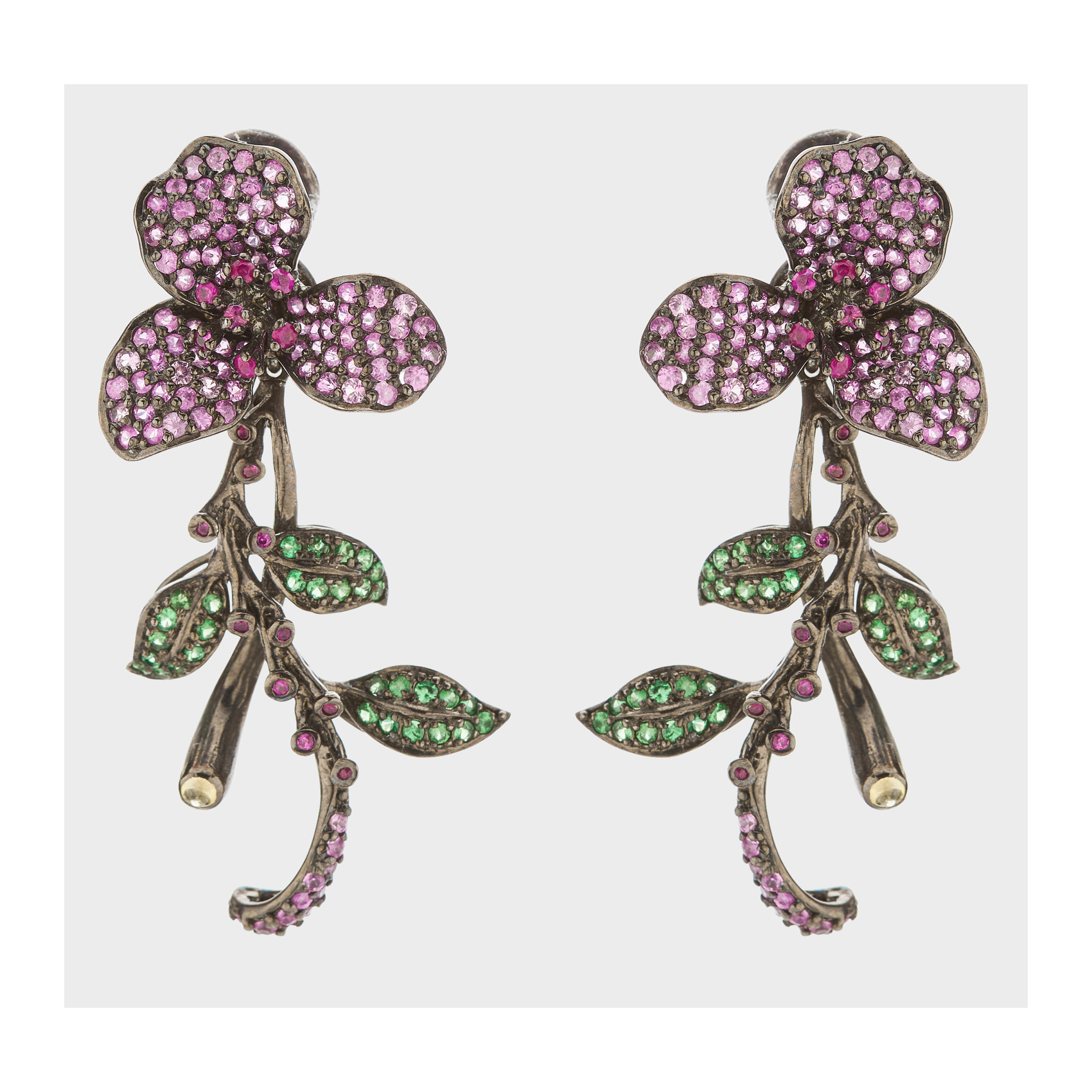 Pendientes largos diseño flor en plata pavonada con zafiros rosas y verdes.