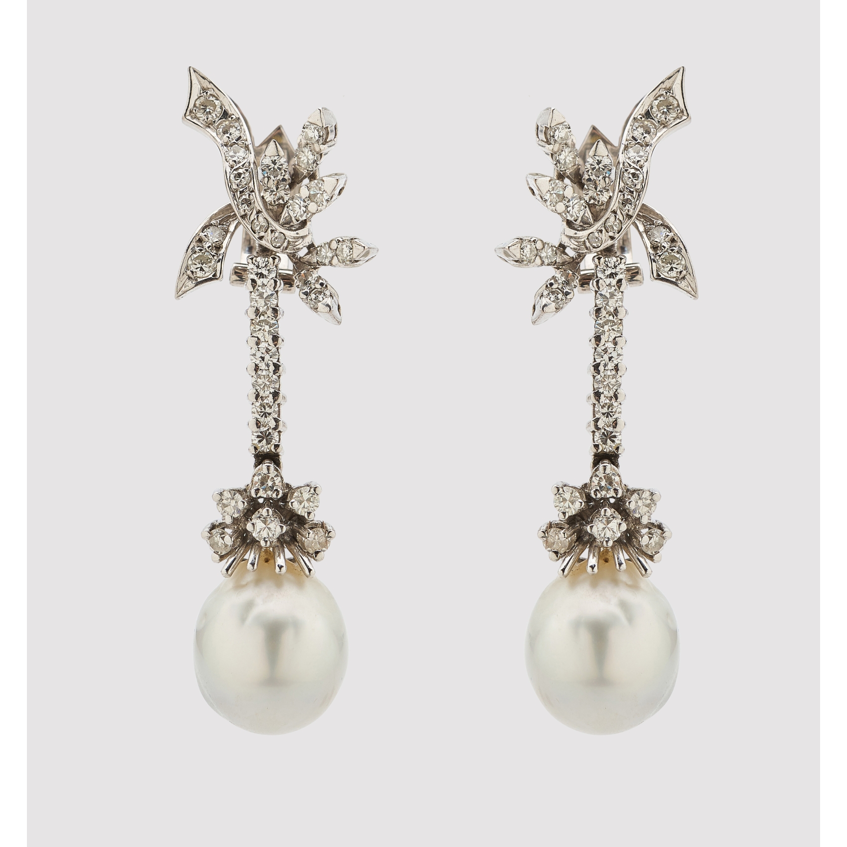 Pendientes largos en oro blanco con hojas, lazada y barrita de diamantes talla brillante rematadas por perla cultivada barroca de 13 x 11 mm.
