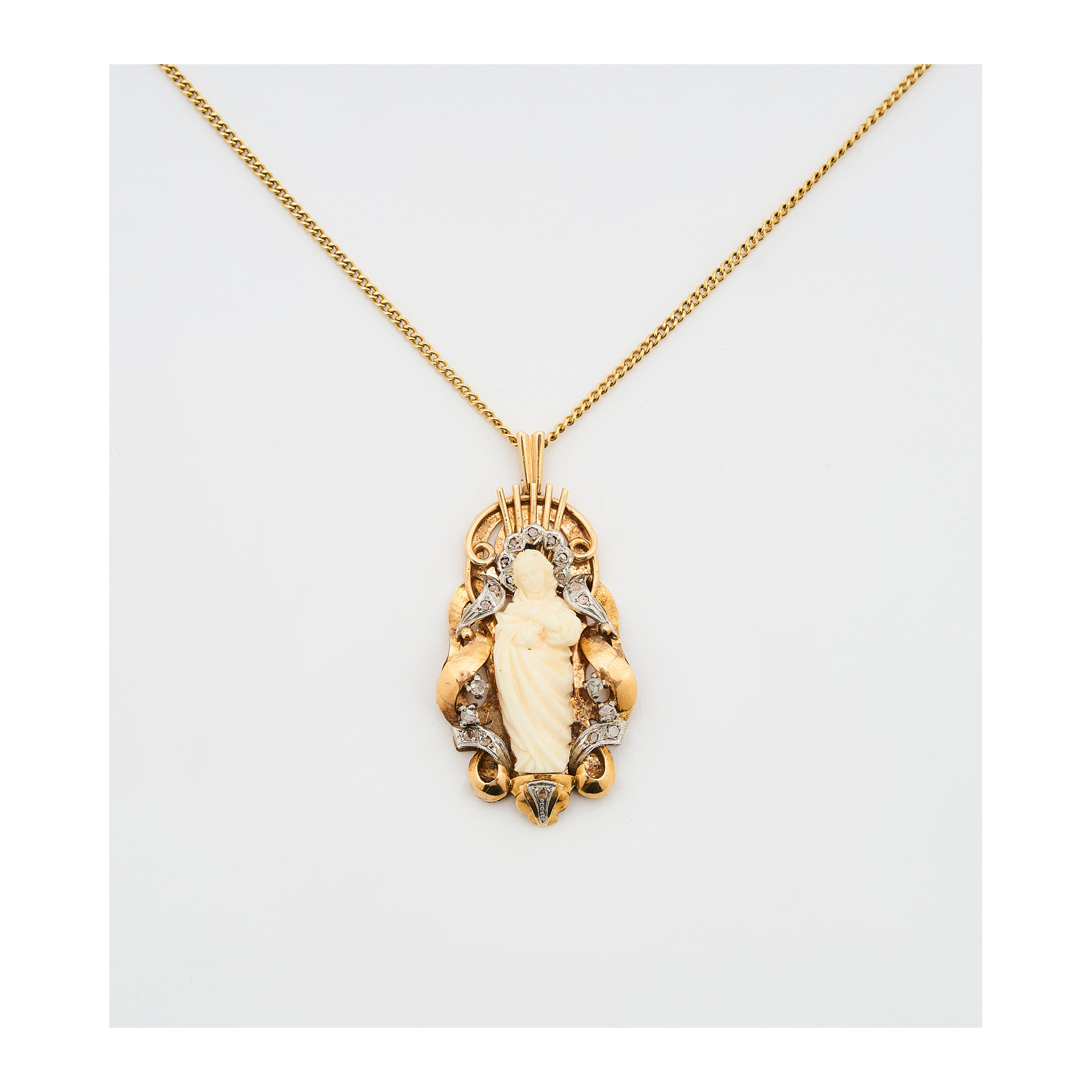 Medalla capilla en oro y vistas en platino con Virgen en resina y diamantes talla rosa, c. 1940.
