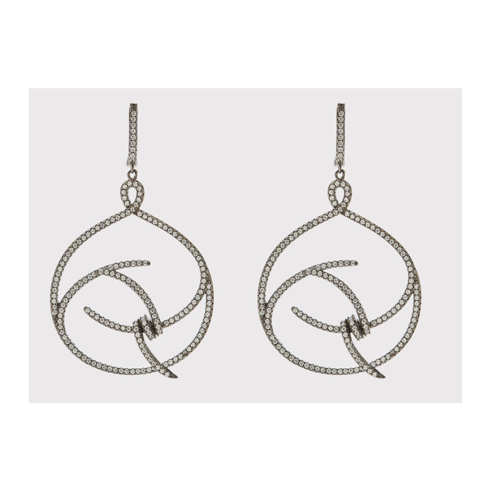 Pendientes largos calados en plata pavonada y circonitas.