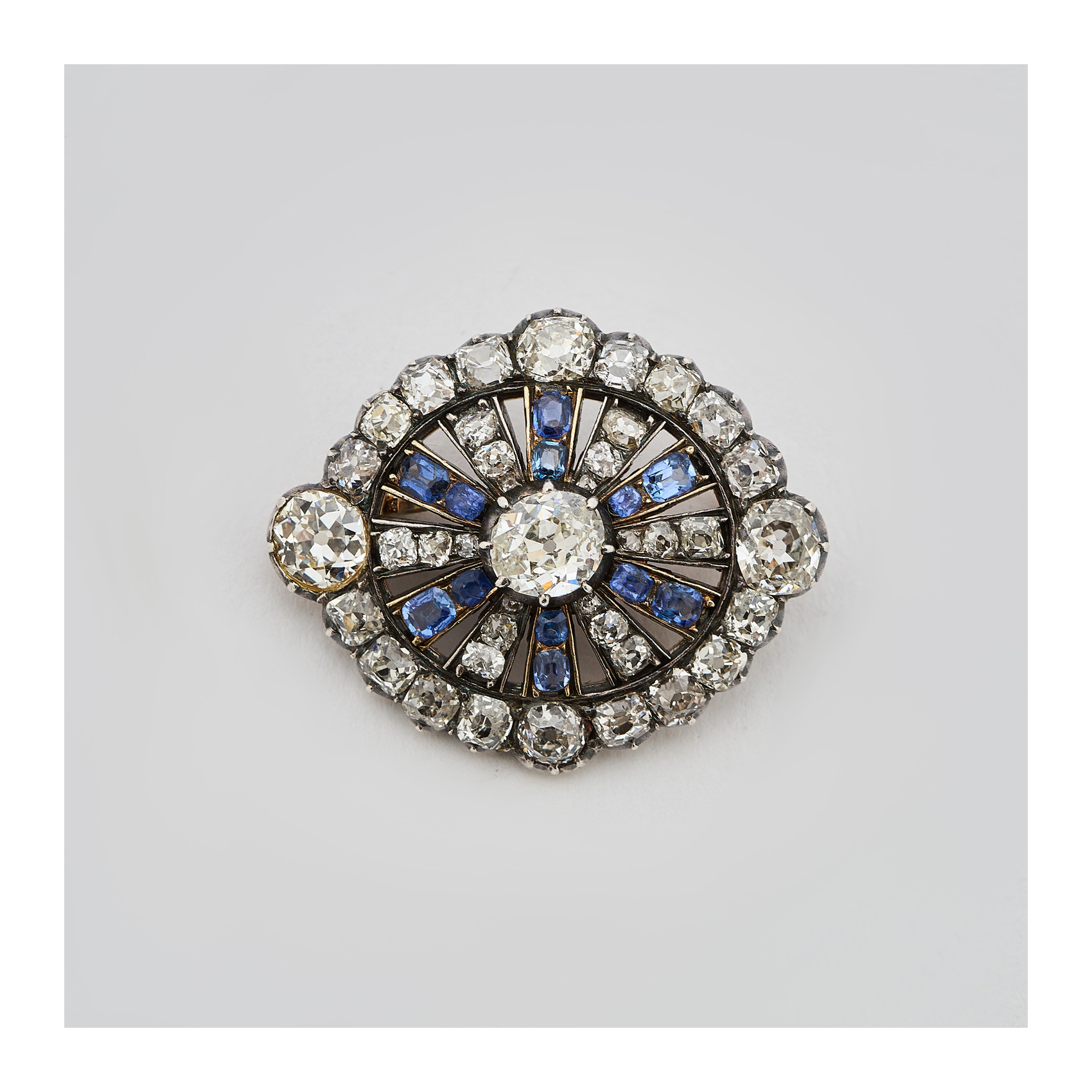 Broche isabelino en oro y vistas en plata con diamantes talla brillante antigua y zafiros azules talla cojín, tercer cuarto del s.XIX.