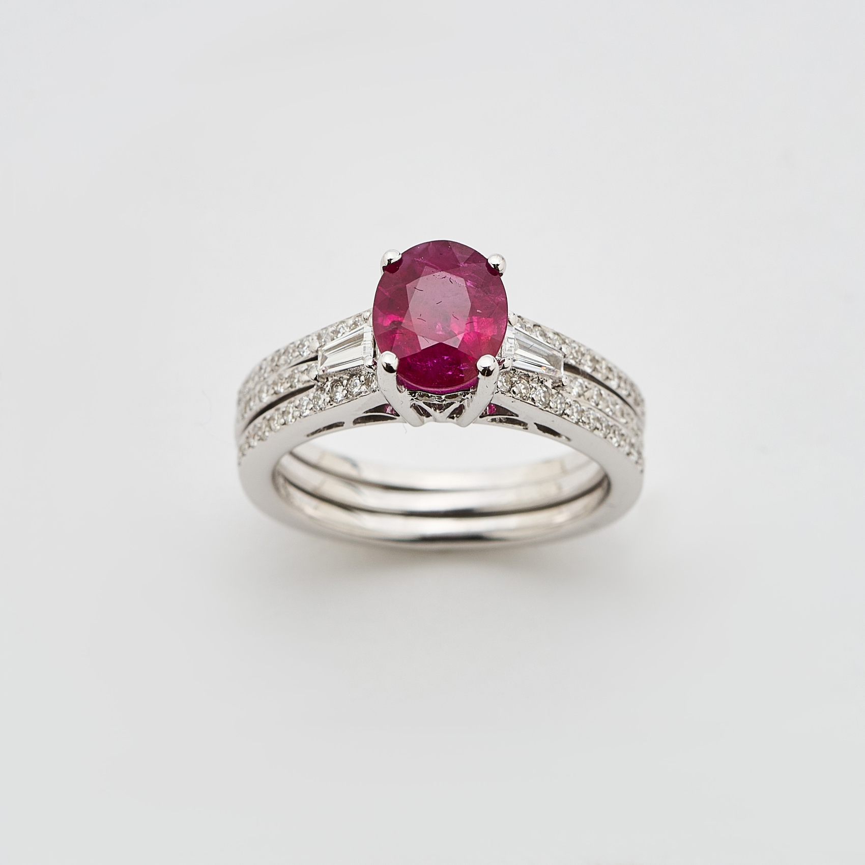 Dos sortijas adaptables en oro blanco, una con rubí de Burma talla oval y otra diseño media alianza, ambas con diamantes talla brillante.