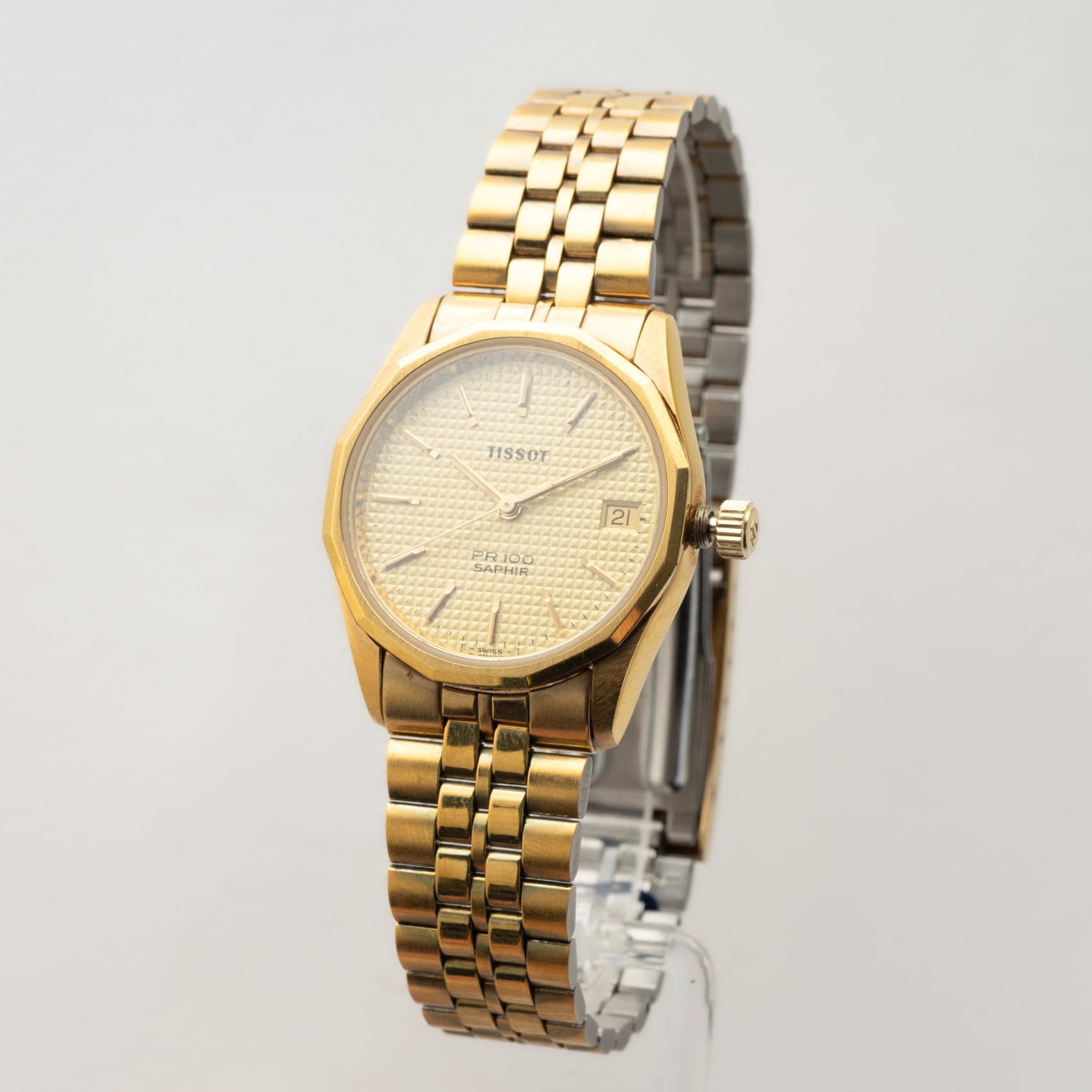 TISSOT. Reloj de pulsera unisex. En plaqué oro. Esfera dorada con decoración de punta de diamante. Calendario fecha a las 3. Mecanismo de quartz.