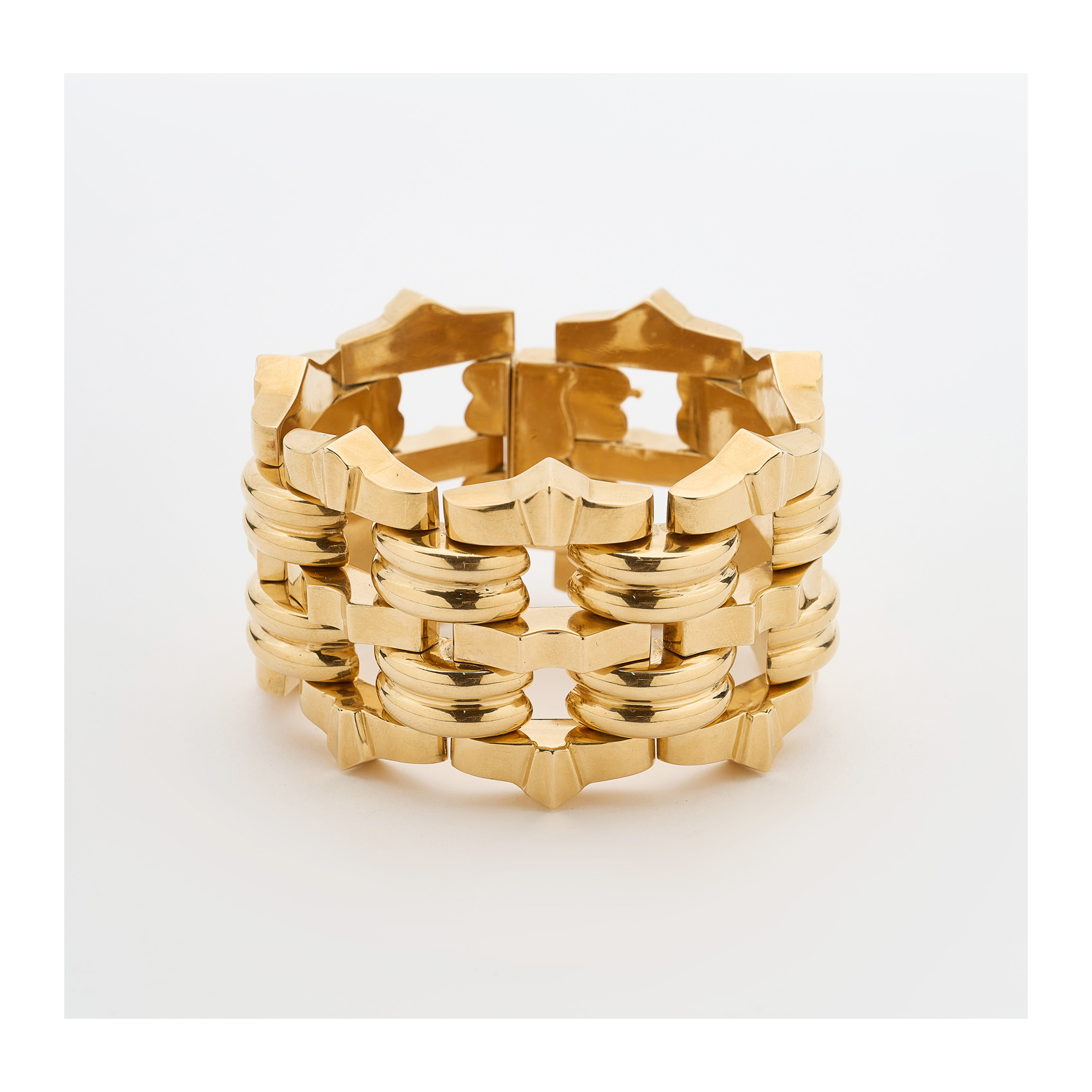 Pulsera calada en oro con dos bandas centrales de eslabones gallonados, c.1950.