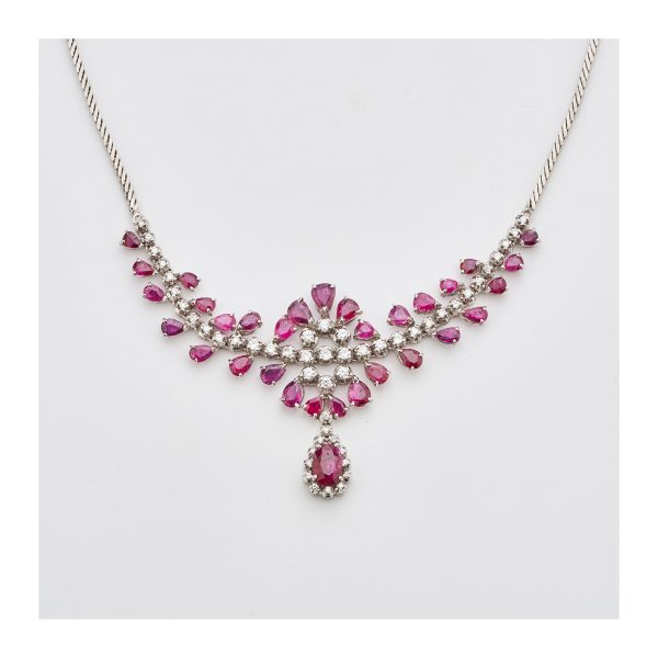 Gargantilla en oro blanco con tira central de diamantes talla brillante custodiada por rubíes tallas perilla y trillón y rematados por lágrima de rubí talla oval orlado por brillantes.