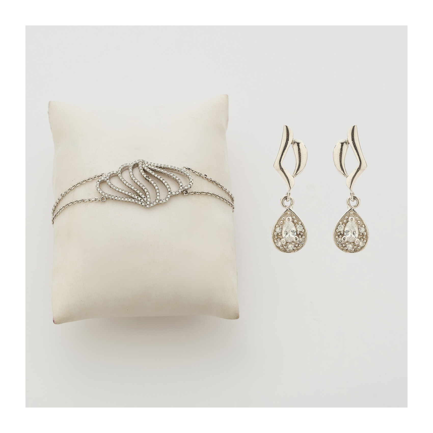 Pendientes largos con lágrima de circonitas tallas redonda y perilla y pulsera de motivo central calado con ondas de circonitas, 4 x 2 cm.