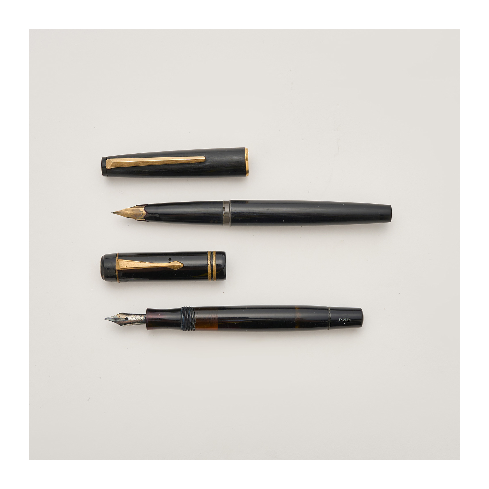 MONTBLANC. Dos estilográficas vintage, modelos Nº 220 y 232 en resina negra y detalles dorados. Una con plumín en oro 14K y sistema de carga por cartucho y la otra con sistema de carga por émbolo. Estimación:280 – 340€