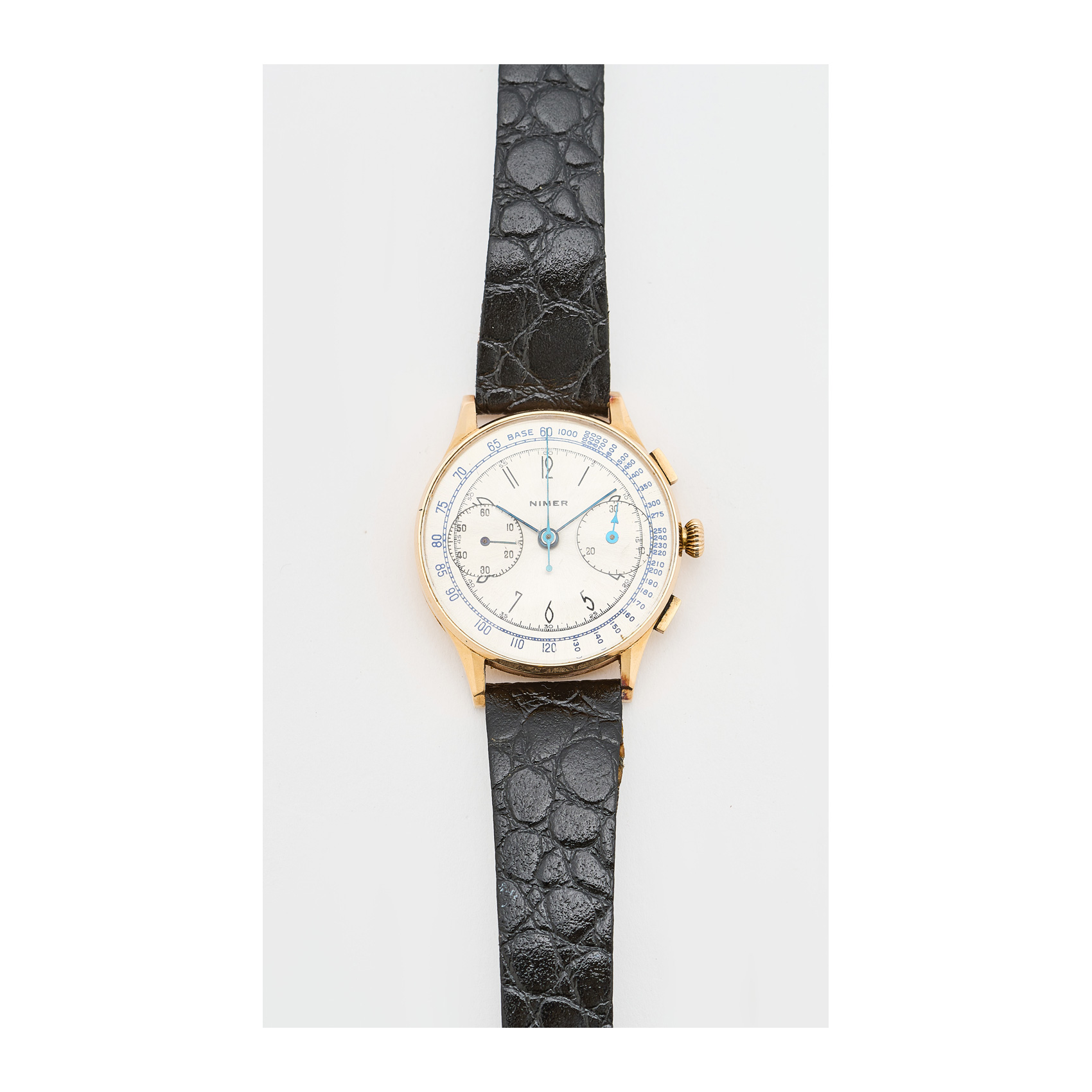 NIMER. Reloj cronómetro de pulsera para caballero, c.1940. En oro y correa de piel. Esfera argenté con numeración arábiga. Segundero a las 9. Mecanismo de cuerda manual.