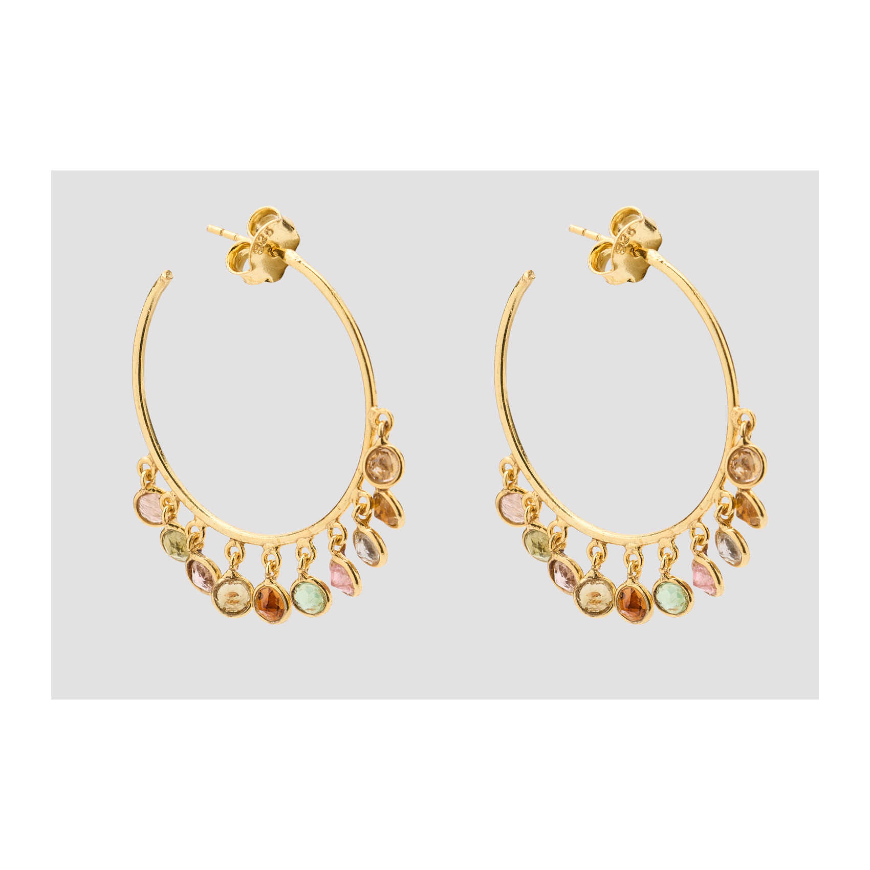 Pendientes criolla en plata dorada con frente de turmalinas multicolor talla redonda de 4 mm.