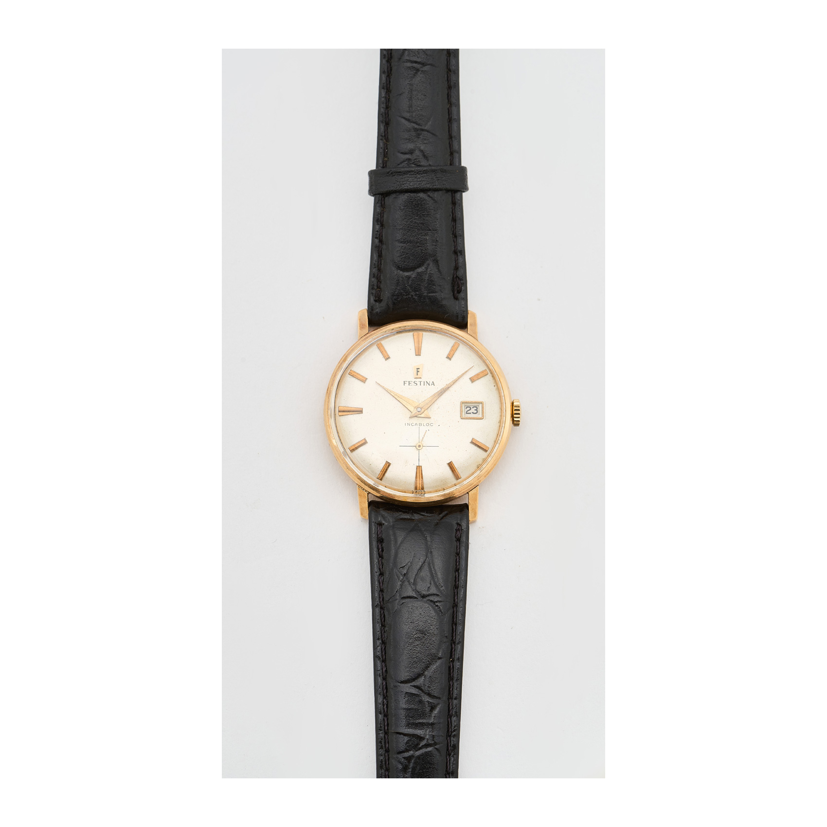 FESTINA. Reloj de pulsera unisex. En oro y correa de piel, c.1960. Esfera satinada con numeración a trazos aplicados. Calendario fecha a las 3. Mecanismo de cuerda manual.
