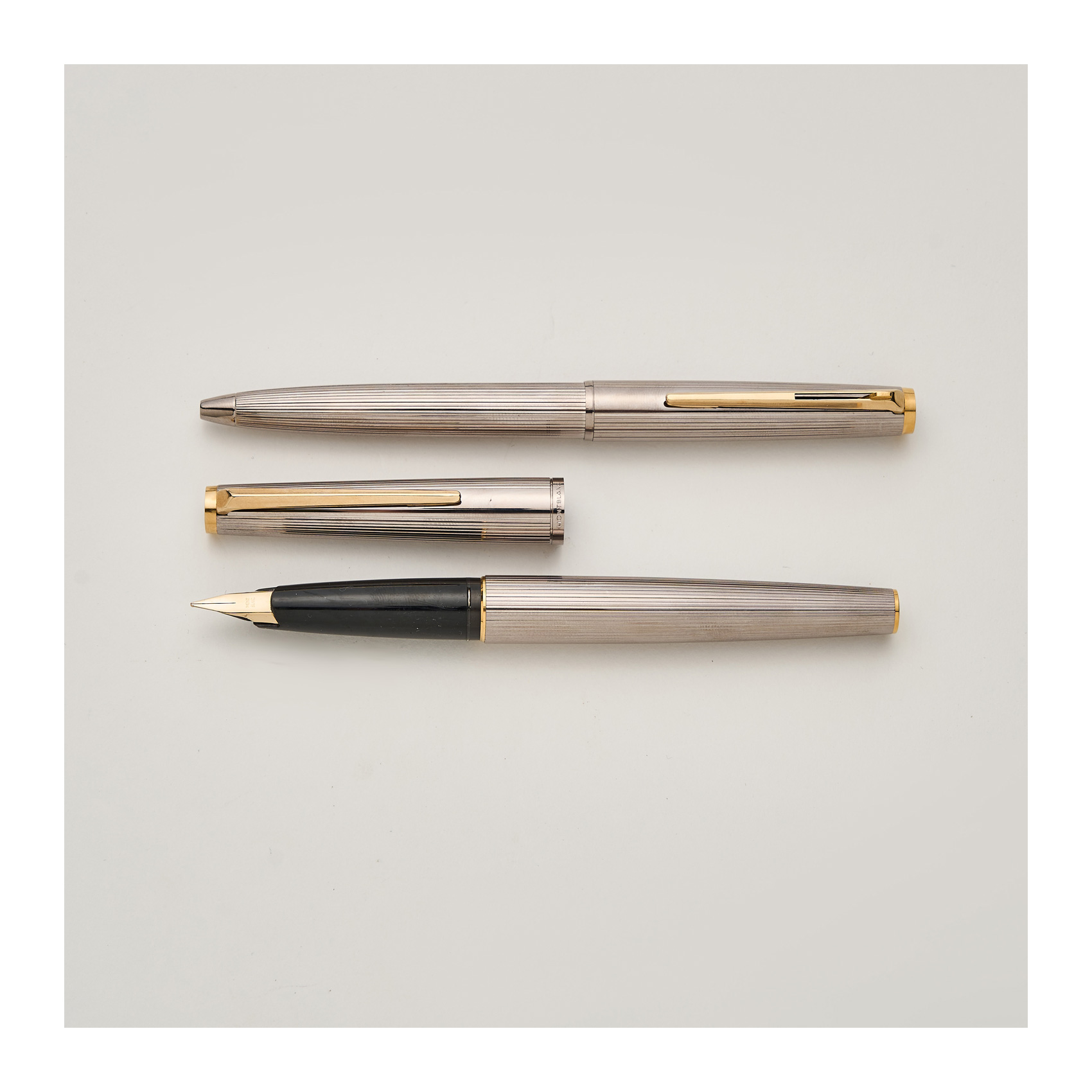 MONTBLANC. Juego de estilográfica y bolígrafo modelo Nº1846 en acero con decoración estriada y detalles en plaqué oro. Sistema de carga por cartucho. Estimación:380 – 450€
