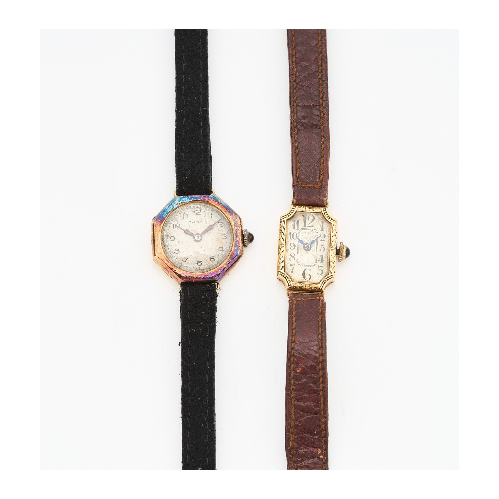Dos relojes de pulsera para señora. En oro y correa de piel, CONTY con caja octogonal, esfera blanca y numeración arábiga, c.1930. y el segundo sin marca, con caja rectangular labrada, esfera blanca y numeración arábiga, c.1920. Ambos con mecanismo de cuerda manual.