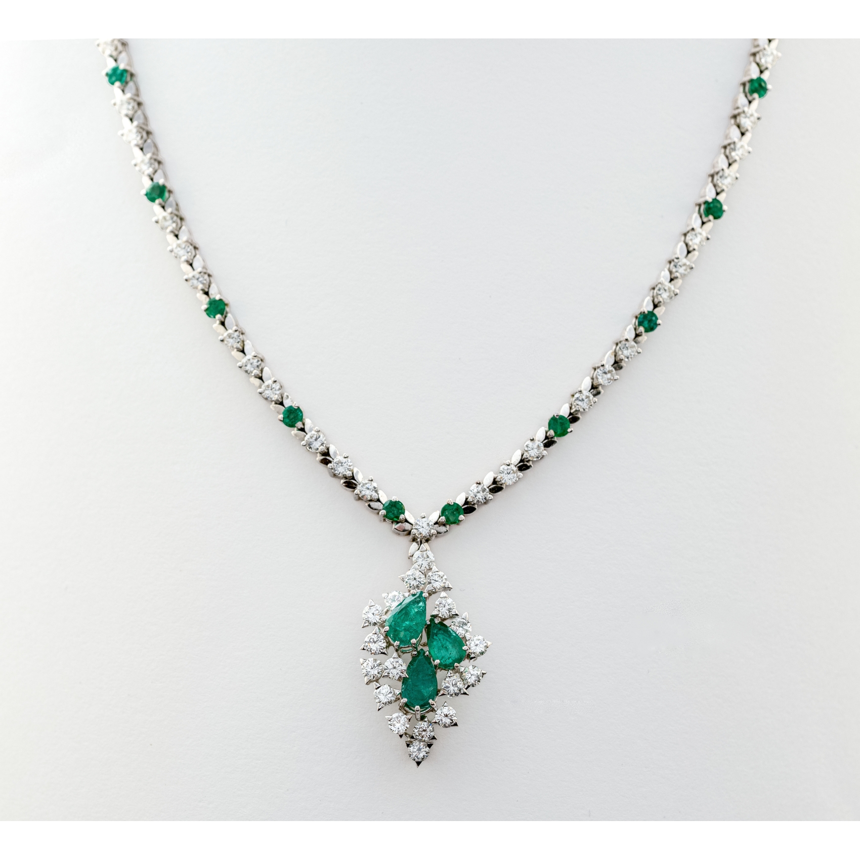Gargantilla en oro blanco con cadena diseño rivière y colgante en cascada de diamantes talla brillante y esmeraldas tallas redonda y perilla engastados en garras.