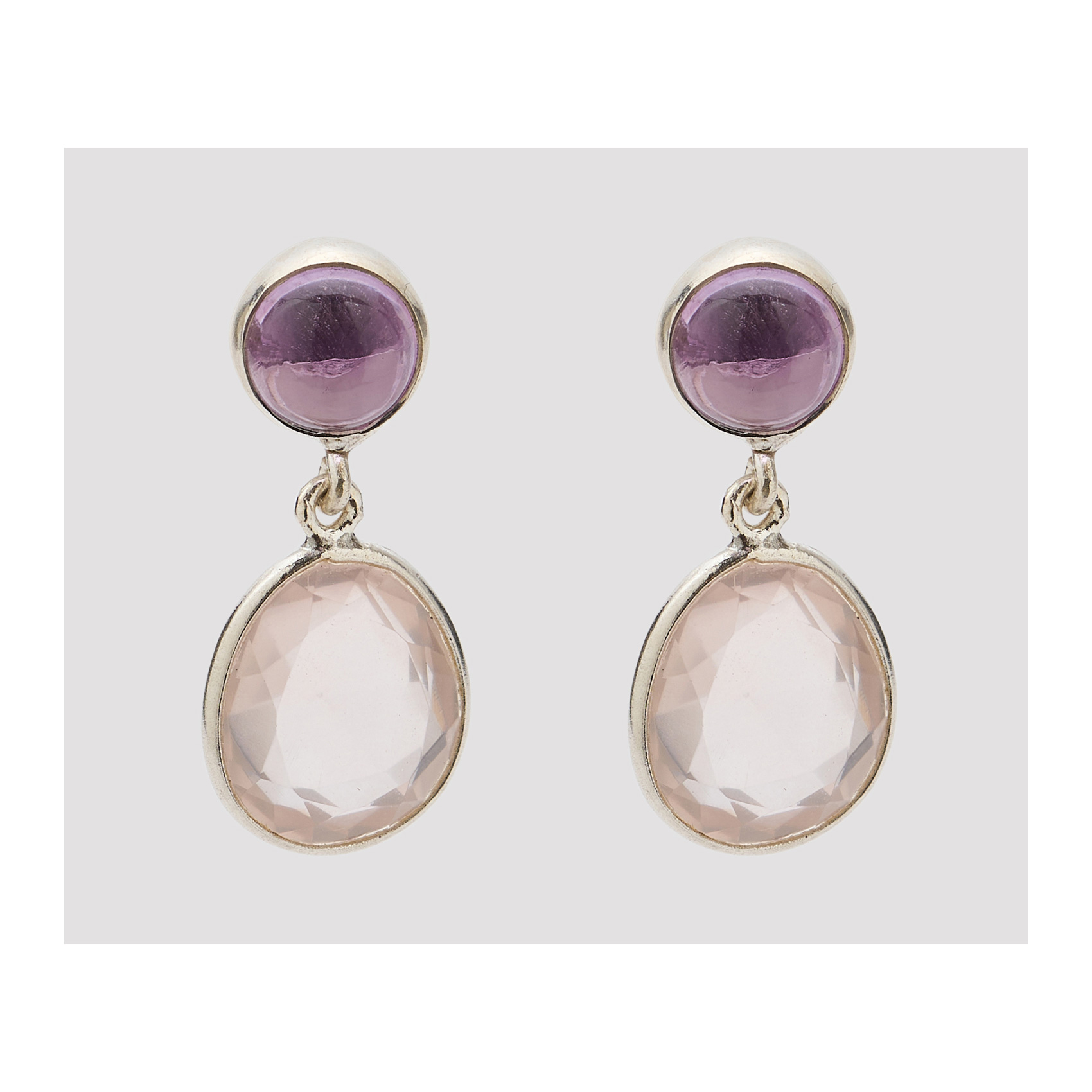 Pendientes en plata con cabujón de símil de amatista de 7 mm. y cuarzo rosa de 12 x 10 mm. Estimación:100 – 130€