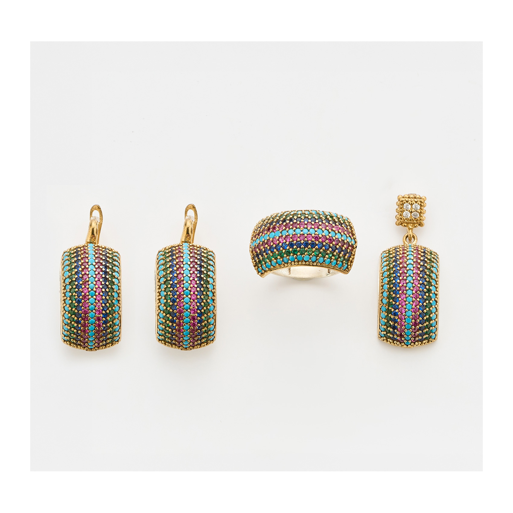 Juego de pendientes, sortija y colgante diseño bombé en plata y plata dorada con bandas de símiles de turquesa, rubíes, esmeraldas y zafiros azules talla redonda.