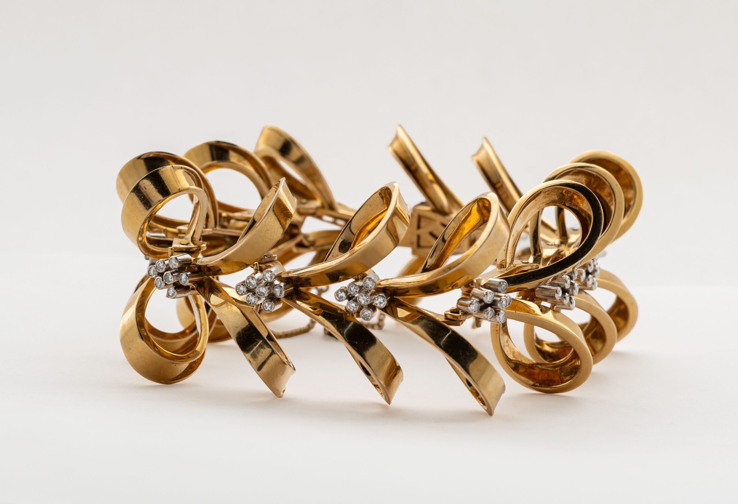 Brazalete en oro bicolor con lazadas y conjuntos de diamantes talla 8/8 engastados en chatón.