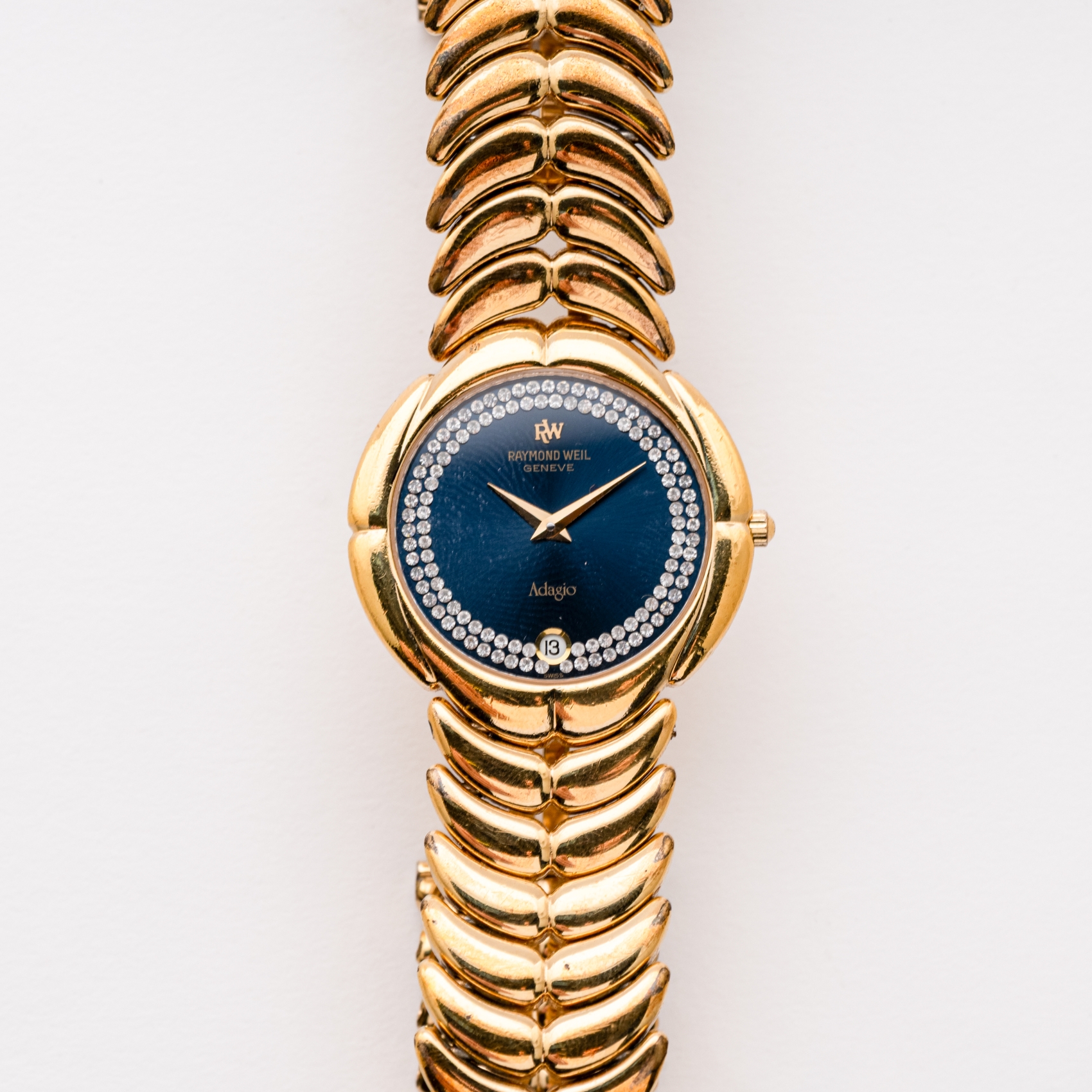 RAYMOND WEIL, «Adagio». Reloj de pulsera para señora en plaqué oro. Ref. 9135. Bisel y armis gallonados, cierre desplegable. Esfera azul sin numeración y dos hileras de circonitas talla redonda. Mecanismo de quartz.