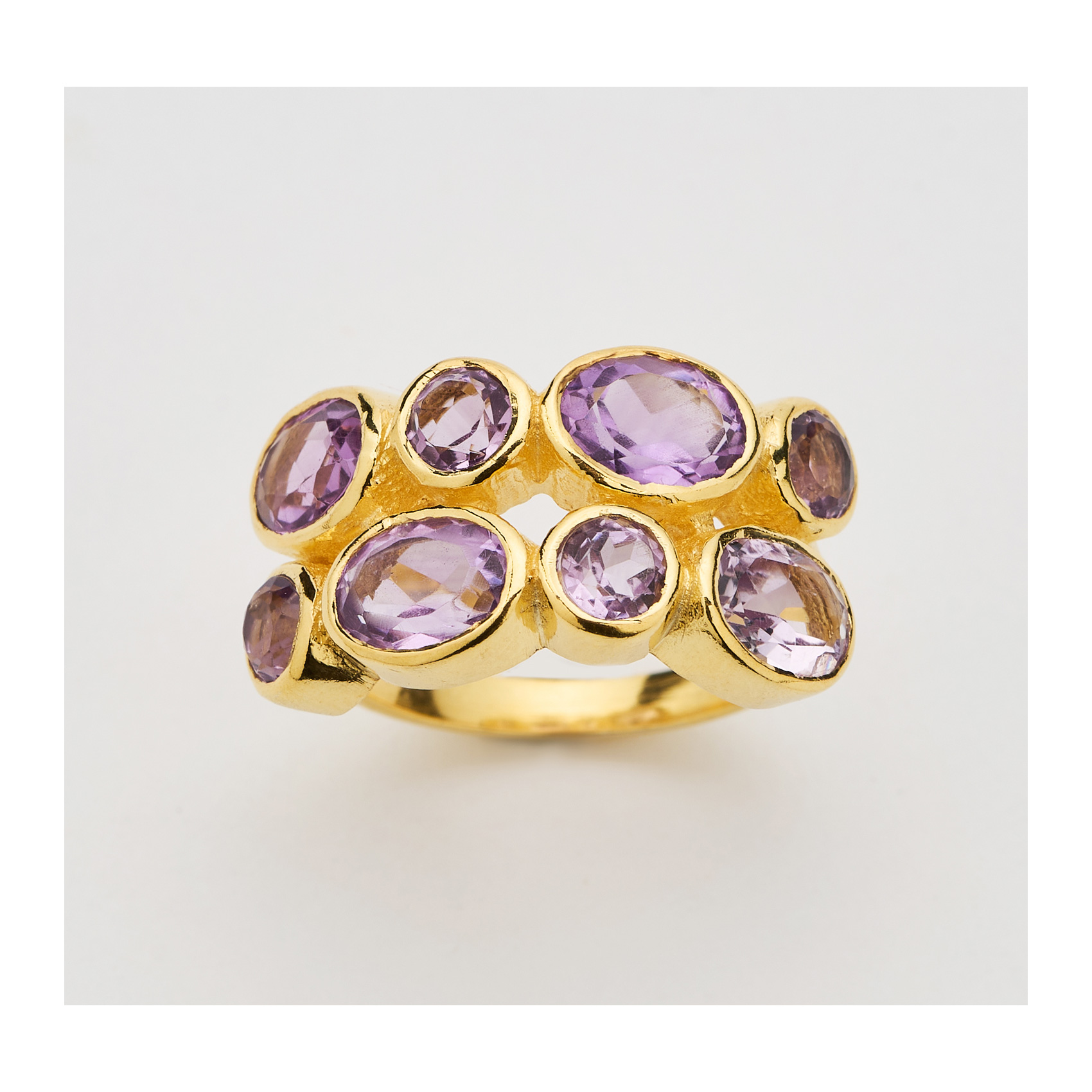 Sortija en plata dorada con amatistas tallas oval y redonda engastadas en chatón.