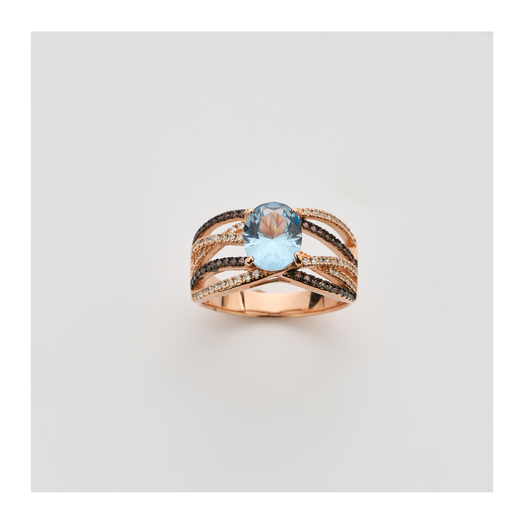 Sortija rosetón en plata y símil de topacio azul talla cojín de 9,5 x 8,5 mm. con doble orla y brazos de circonitas tallas redonda y baguette.