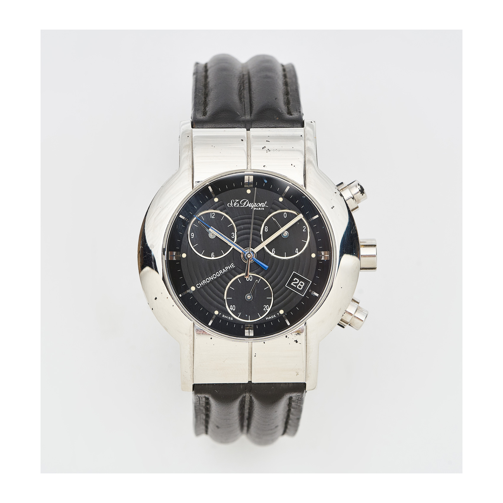 S.T. DUPONT. Reloj cronógrafo de pulsera unisex. En acero y correa de piel. Esfera negra con numeración a trazos aplicados. Calendario fecha a las 4 y segundero a las 6. Mecanismo de quartz.