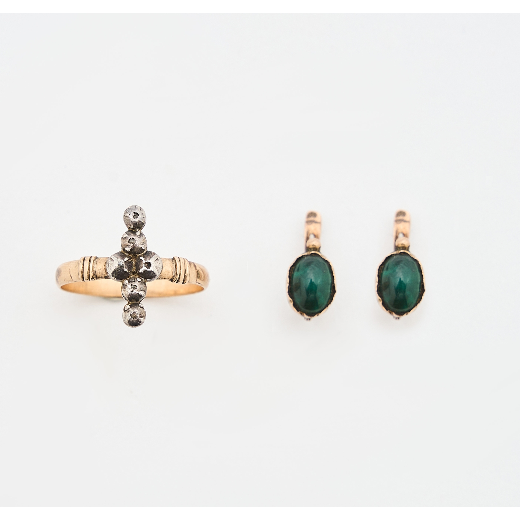 Lote de sortija lanzadera en oro y plata con diamantes talla rosa 3/3 y pendientes con cabujón de crisoprasa de 7 x 6 mm. Ambos en oro 9K, tercer cuarto del s.XIX.