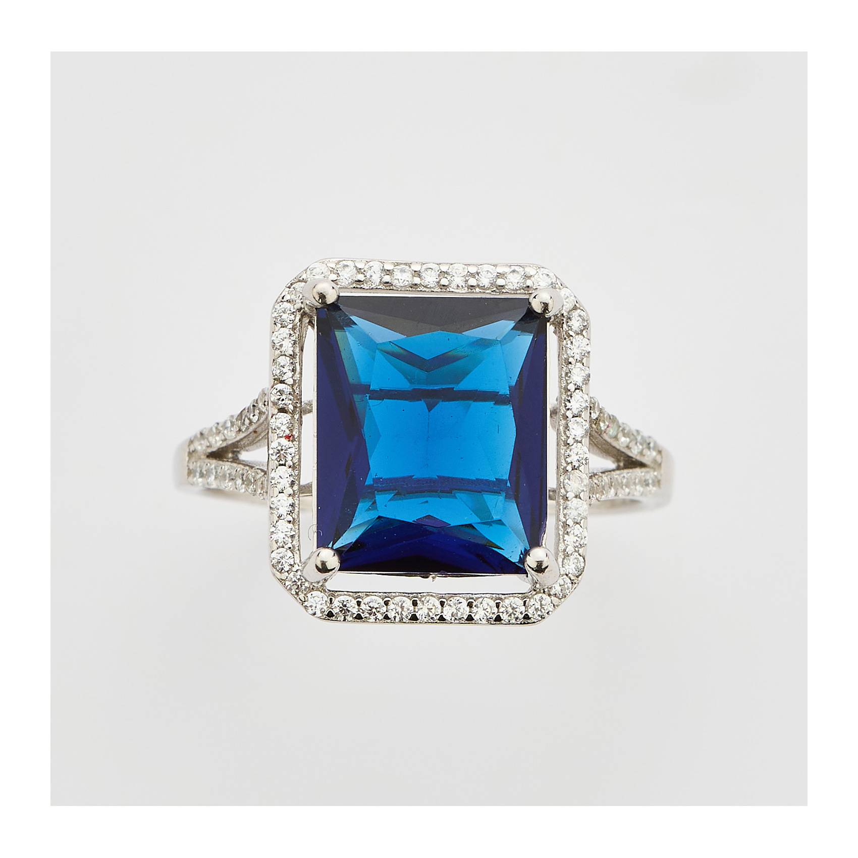 Sortija en plata y símil de zafiro azul talla rectangular de 11,5 x 9,5 mm. con orla y brazos de circonitas.