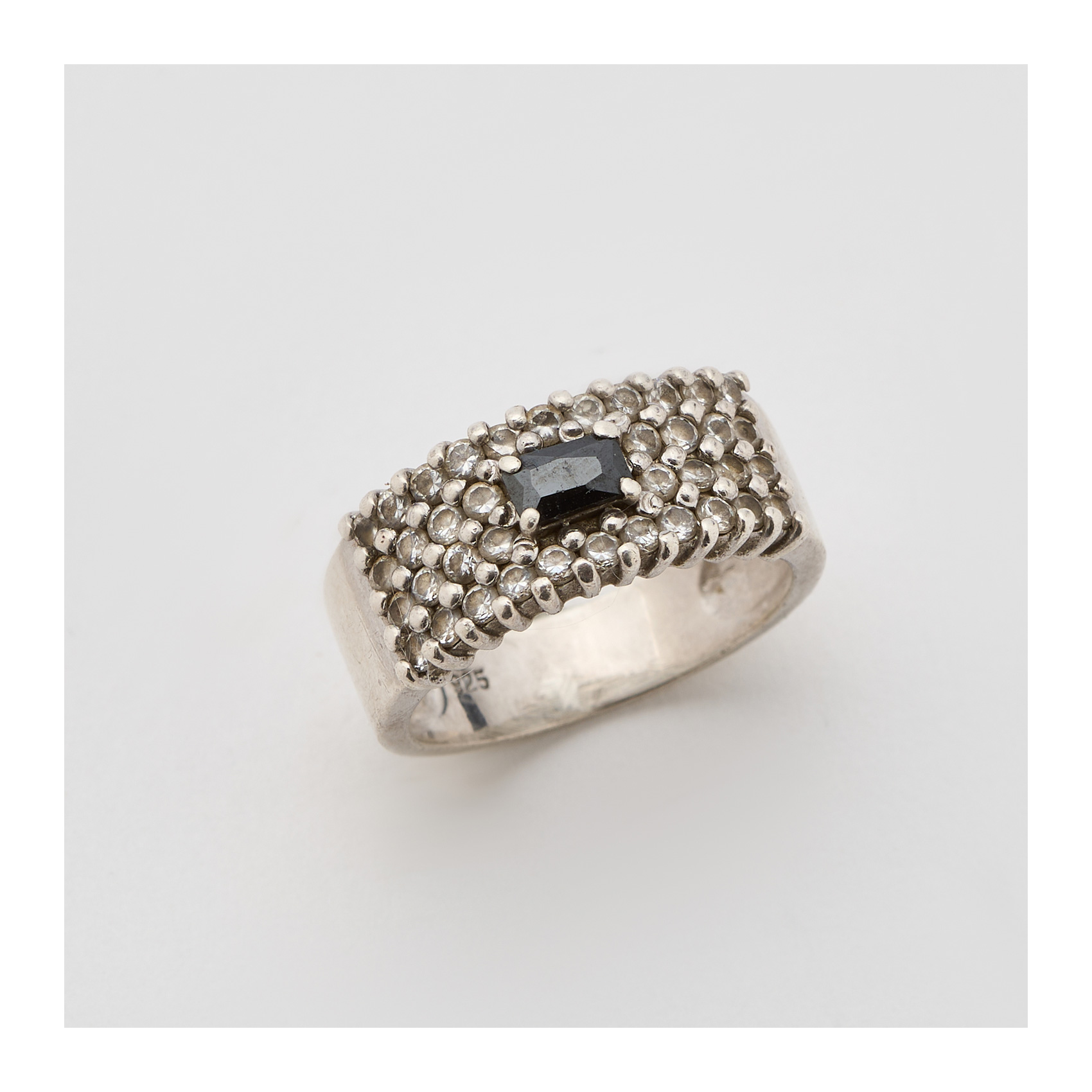 Sortija en plata con piedra central rectangular de 4,5 x 2,5 mm. en color negro y circonitas.