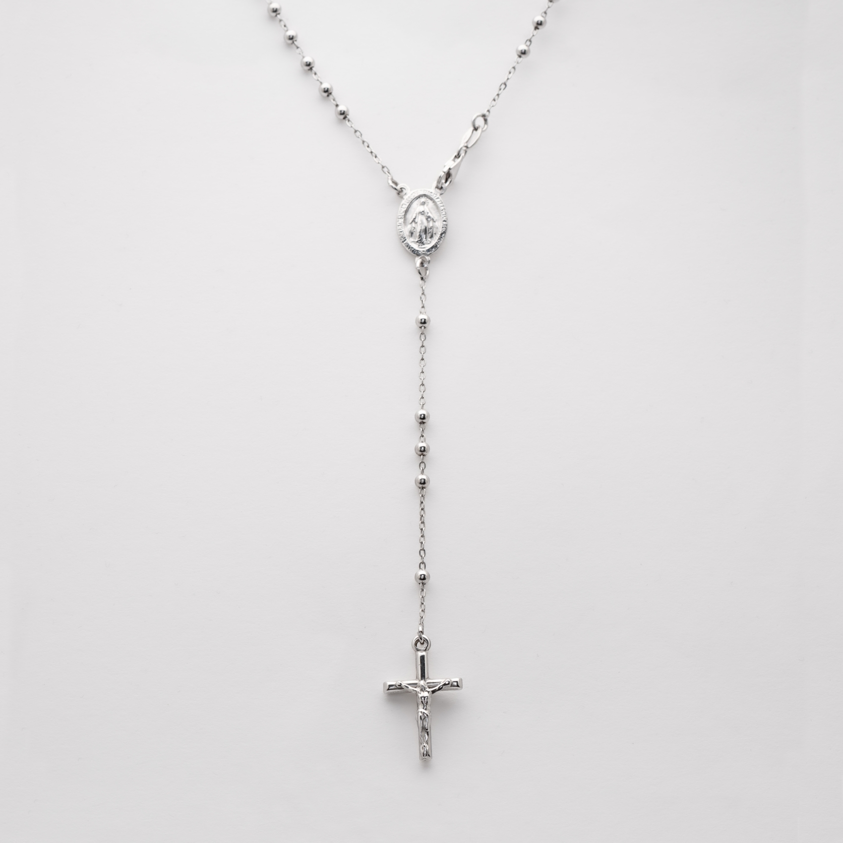 Gargantilla en forma de rosario en plata con cuentas esféricas, medalla de la Virgen Milagrosa rematado con crucifijo.