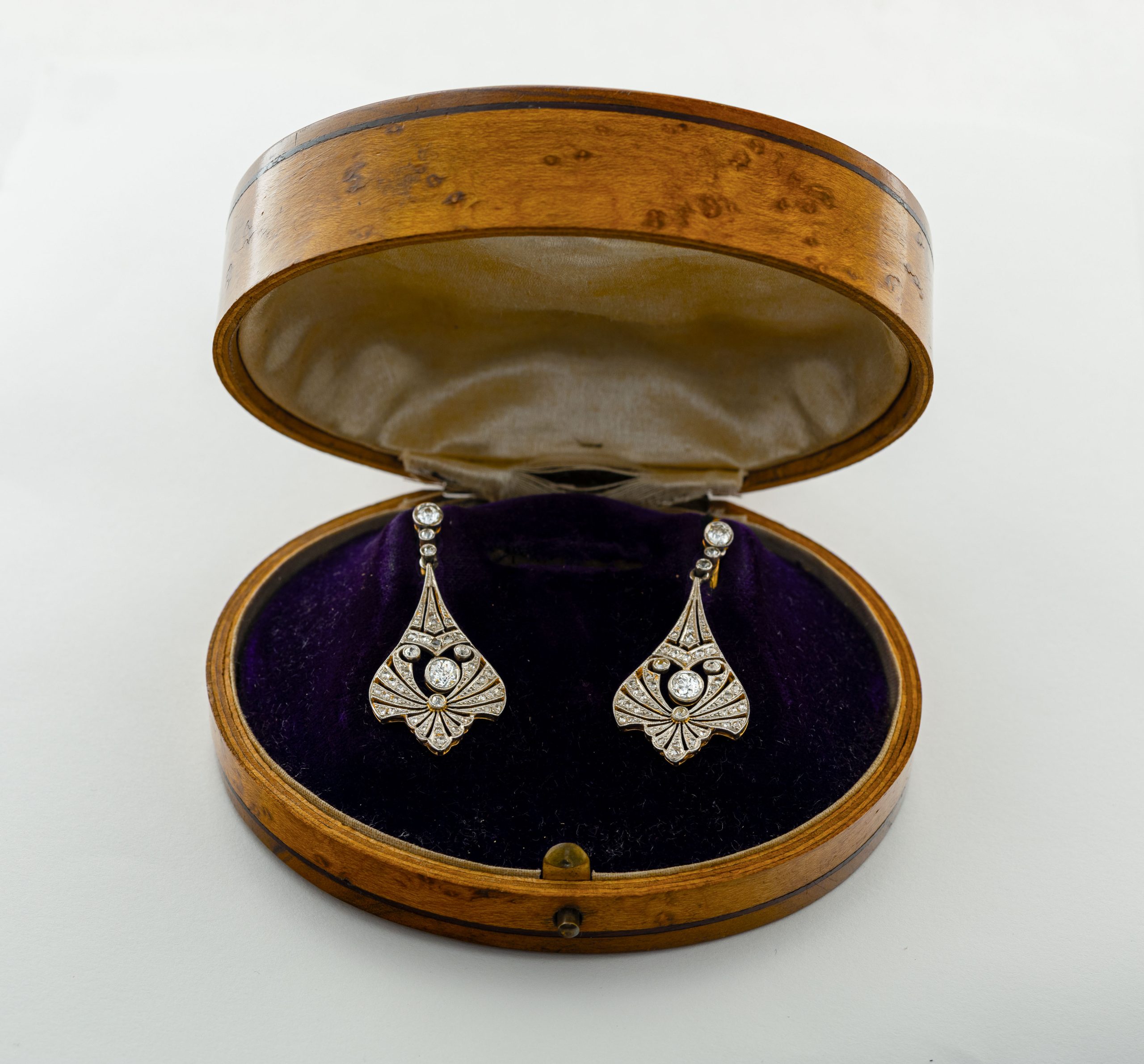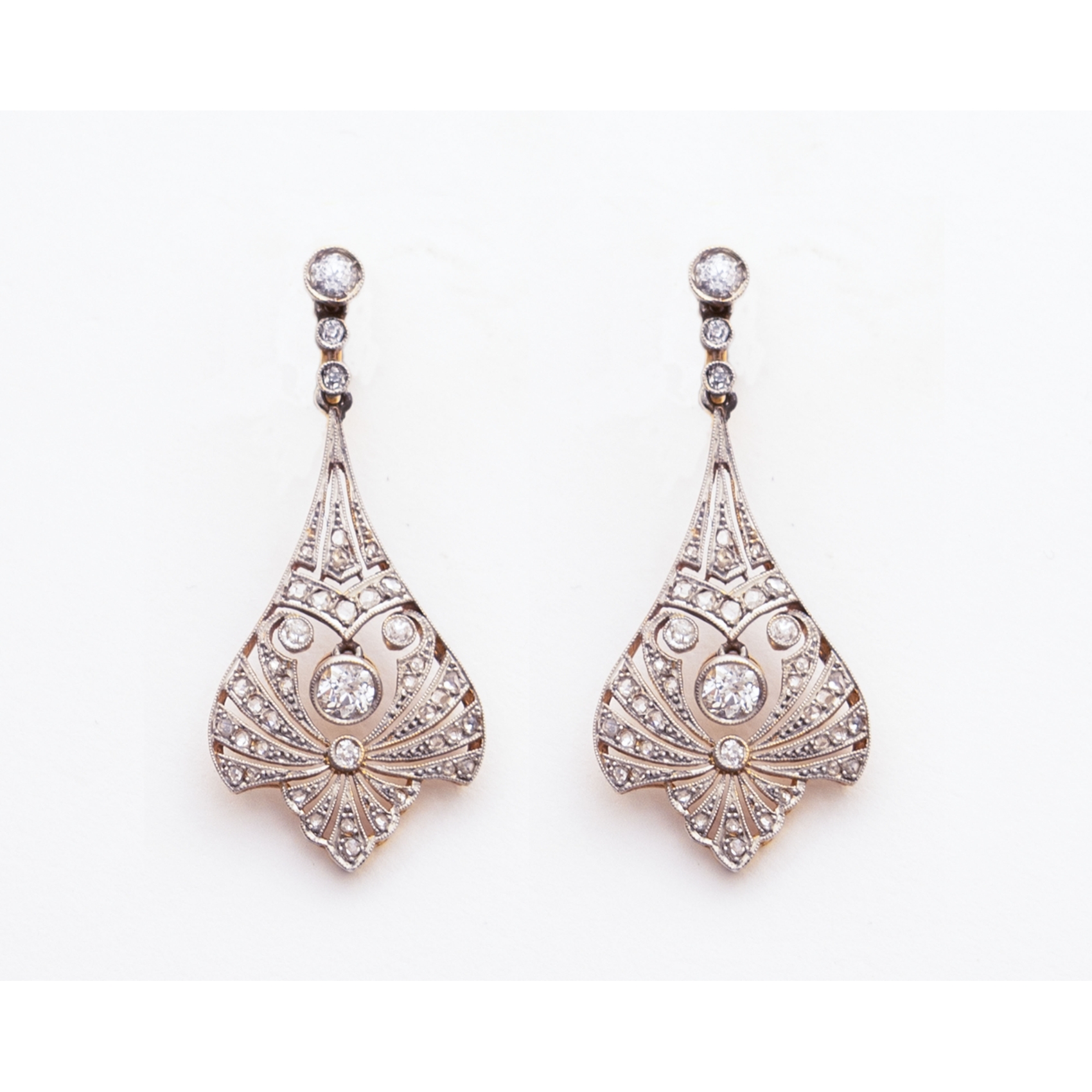Pendientes largos Art Deco en oro y vistas en platino con calado de diamantes tallas brillante antigua y rosa holandesa, c.1930. 4,5 cm