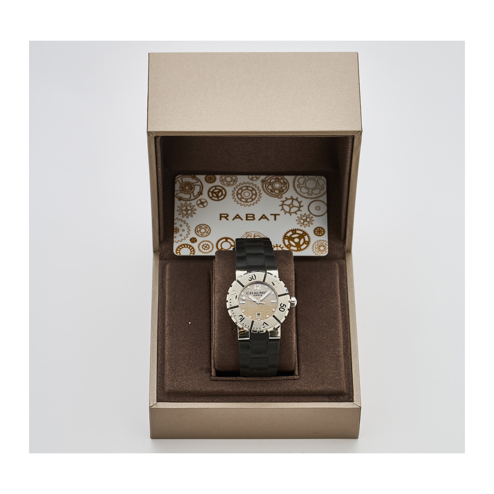 CHAUMET «Class One». Reloj de pulsera para señora en acero y correa de caucho. Esfera gris con decoración guilloché, numeración punteada y a trazos aplicados, calendario fecha a las 6. Bisel giratorio. Mecanismo de quartz.