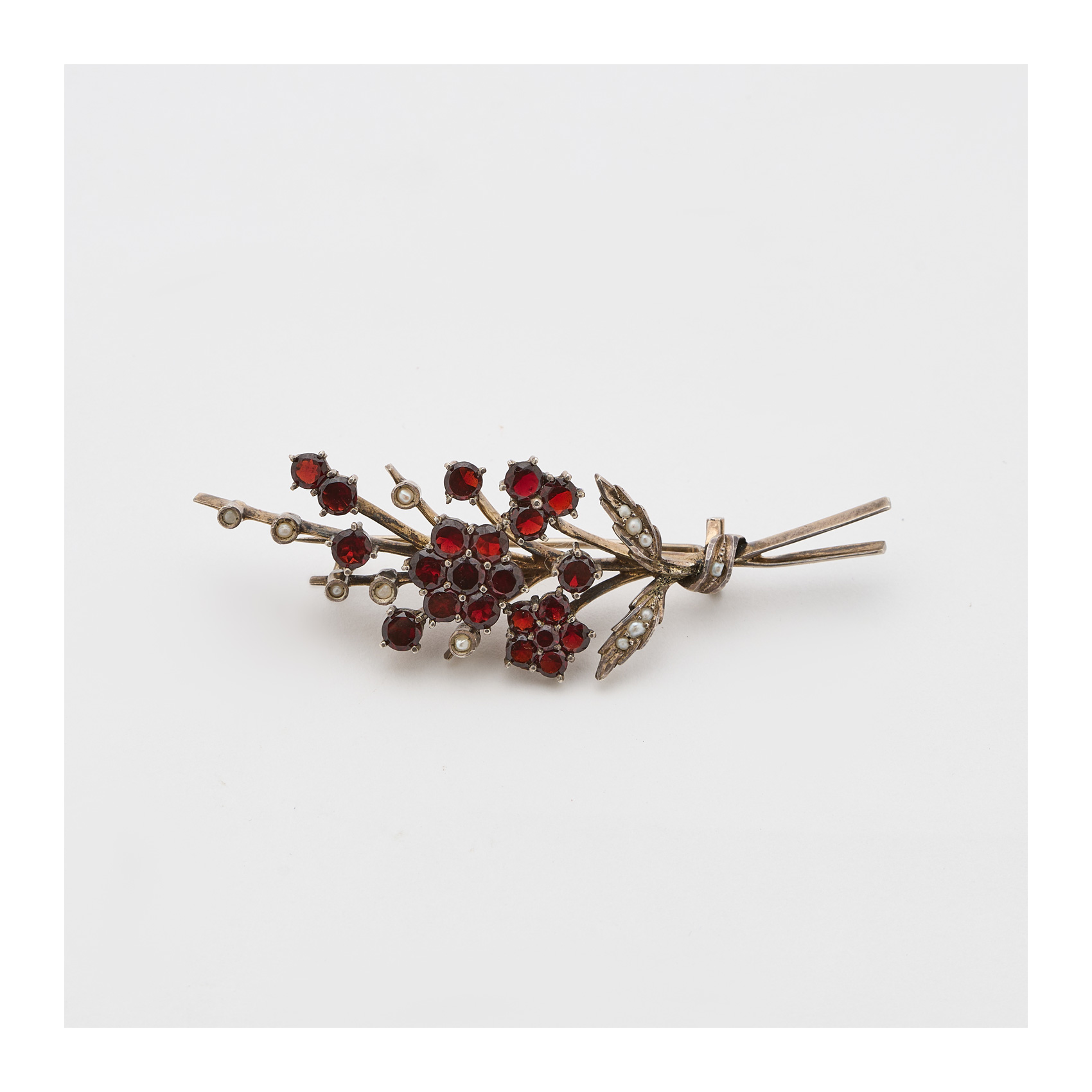 Broche diseño ramo floral en plata con símiles de granate talla redonda y perlas de aljofar, 7,2 cm. Estimación:120 – 150€
